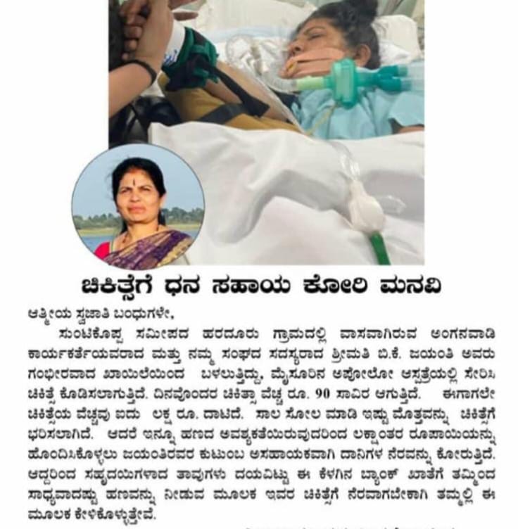 ಸುಂಟಿಕೊಪ್ಪ ಸಮೀಪದ ಹರದೂರು ಗ್ರಾಮದಲ್ಲಿ ವಾಸವಾಗಿರುವ ಅಂಗನವಾಡಿ ಕಾರ್ಯಕರ್ತೆಯವರಾದ ಶ್ರೀಮತಿ ಬಿ.ಕೆ. ಜಯಂತಿ ಅವರು ಗಂಭೀರವಾದ ಖಾಯಿಲೆಯಿಂದ ಬಳಲುತ್ತಿದ್ದು, ಮೈಸೂರಿನ ಅಪೋಲೋ ಆಸ್ಪತ್ರೆಯಲ್ಲಿ ಸೇರಿಸಿ ಚಿಕಿತ್ಸೆ ಕೊಡಿಸಲಾಗುತ್ತಿದೆ. ದಿನವೊಂದರ ಚಿಕಿತ್ಸಾ ವೆಚ್ಚ ರೂ. 90 ಸಾವಿರ ಆಗುತ್ತಿದೆ. ಈಗಾಗಲೇ ಚಿಕಿತ್ಸೆಯ ವೆಚ್ಚವು ಐದು ಲಕ್ಷ ರೂ. ದಾಟಿದ್ದು . ಸಾಲ ಸೋಲ ಮಾಡಿ ಇಷ್ಟು ಮೊತ್ತವನ್ನು ಚಿಕಿತ್ಸೆಗೆ ಭರಿಸಲಾಗಿದೆ.
