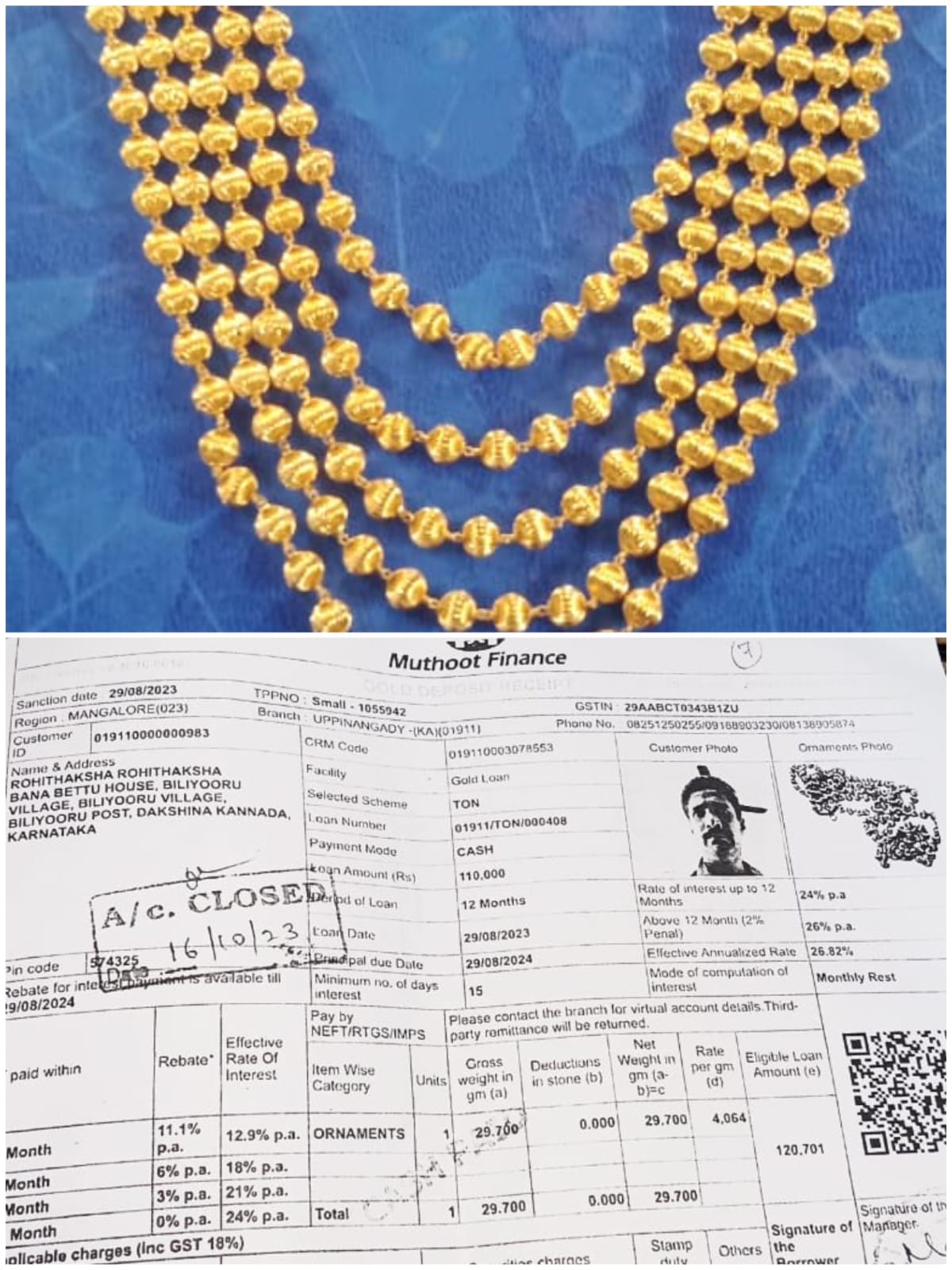 ಗೋಪಾಲ ಶೆಟ್ಟಿಯವರು ದೂರು ಕೊಟ್ಟ ಸಂದರ್ಭದಲ್ಲಿ ಉಲ್ಲೇಖ ಮಾಡಿರುವ ರೋಹಿತಾಕ್ಷ ಬಾಣಬೆಟ್ಟು ಇವರು ದೇವರ ಜೋಮಾಲೆಯನ್ನ ಉಪ್ಪಿನಂಗಡಿಯ ಮುತ್ತೂಟ್ ಫಿನಾನ್ಸ್ನಲ್ಲಿ ಅಡಮಾನ ಇಟ್ಟಿದ್ದಾರೆ ಅನ್ನೋ ವಿಚಾರ ಇದೀಗ ಬಯಲಾಗಿದೆ. 2023ರ ಆಗಸ್ಟ್ 29ರಂದು ಮುತ್ತೂಟ್ ಪಿನಾನ್ಸ್ನಲ್ಲಿ ದೇವಿಯ ಬಂಗಾರದ ಜೋ ಮಾಲೆಯನ್ನ ಅಡಮಾನ ಇಟ್ಟು 1ಲಕ್ಷದ 10 ಸಾವಿರ ಹಣವನ್ನ ಪಡೆದುಕೊಂಡಿದ್ದಾರೆ.