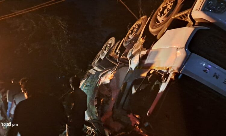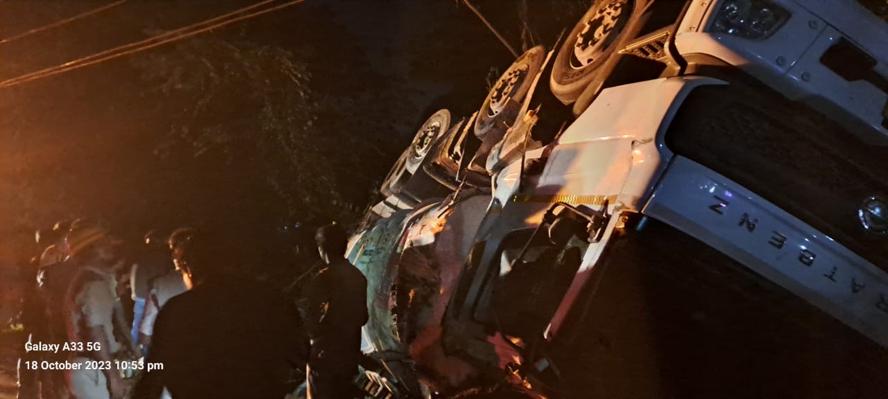 ರಾತ್ರಿ ಸುಮಾರು 10.30 ರ ಹೊತ್ತಿಗೆ ಪಲ್ಟಿಯಾಗಿದ್ದು, ಸ್ಥಳಕ್ಕೆ ಪೋಲೀಸರು ಹಾಗೂ ಅಗ್ನಿಶಾಮಕ ದಳದ ಸಿಬ್ಬಂದಿ ಆಗಮಿಸಿ ತೆರವುಕಾರ್ಯ ನಡೆಯುತ್ತಿದೆ.