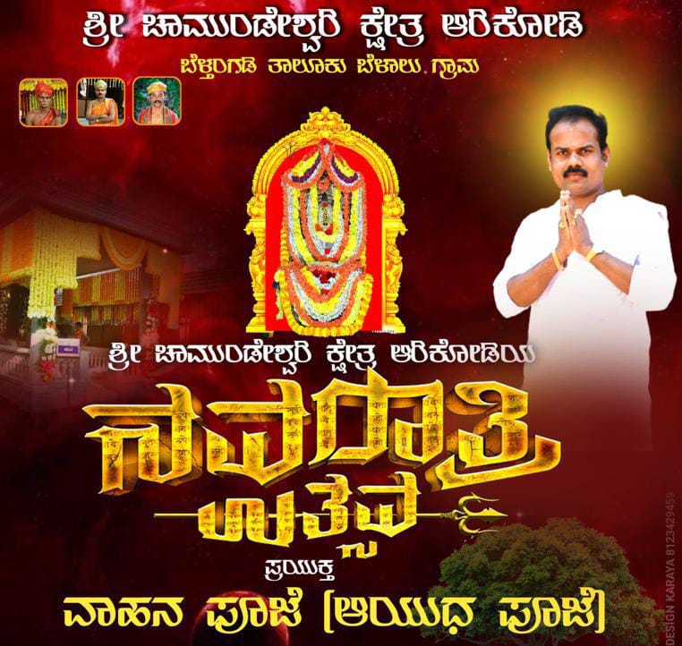 ಬೆಳ್ತಂಗಡಿ : ಆರಿಕೋಡಿ ಶ್ರೀ ಚಾಮುಂಡೇಶ್ವರಿ ಕ್ಷೇತ್ರದಲ್ಲಿ ನವರಾತ್ರಿ ಉತ್ಸವದ ಪ್ರಯುಕ್ತ ಅ.23ರಂದು ವಾಹನಪೂಜೆ (ಆಯುಧ ಪೂಜೆ) ನಡೆಯಲಿದೆ.