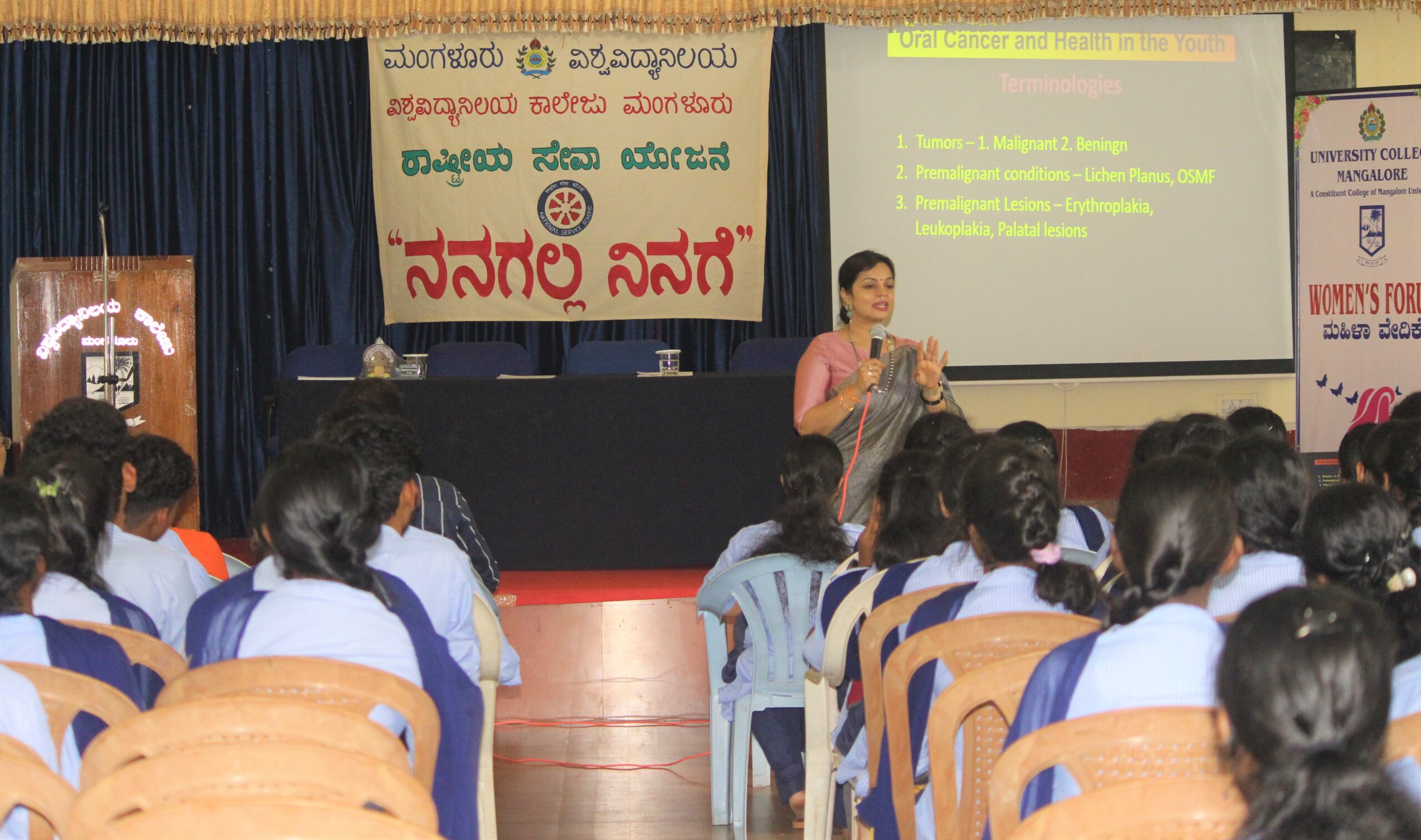 ನಗರದ ವಿಶ್ವವಿದ್ಯಾನಿಲಯ ಕಾಲೇಜಿನ ಶಿವರಾಮ ಕಾರಂತ ಭವನದಲ್ಲಿ ಆಂತರಿಕ ಮೌಲ್ಯಮಾಪನ ಖಾತರಿಕೋಶ, ರಾಷ್ಟ್ರೀಯ ಸೇವಾ ಯೋಜನೆ, ಮಹಿಳಾ ವೇದಿಕೆ ಹಾಗೂ ಸೂಕ್ಷಾಣುಜೀವ ವಿಜ್ಞಾನ ವಿಭಾಗದ ಸಹಯೋಗದಲ್ಲಿ ಆಯೋಜಿಸಲಾಗಿದ್ದ, ಬಾಯಿ ಕ್ಯಾನ್ಸರ್ ಹಾಗೂ ಅದರ ತಡೆಗಟ್ಟುವಿಕೆ ಕುರಿತಾಗಿ ಜಾಗೃತಿ ಮೂಡಿಸಿದರು.