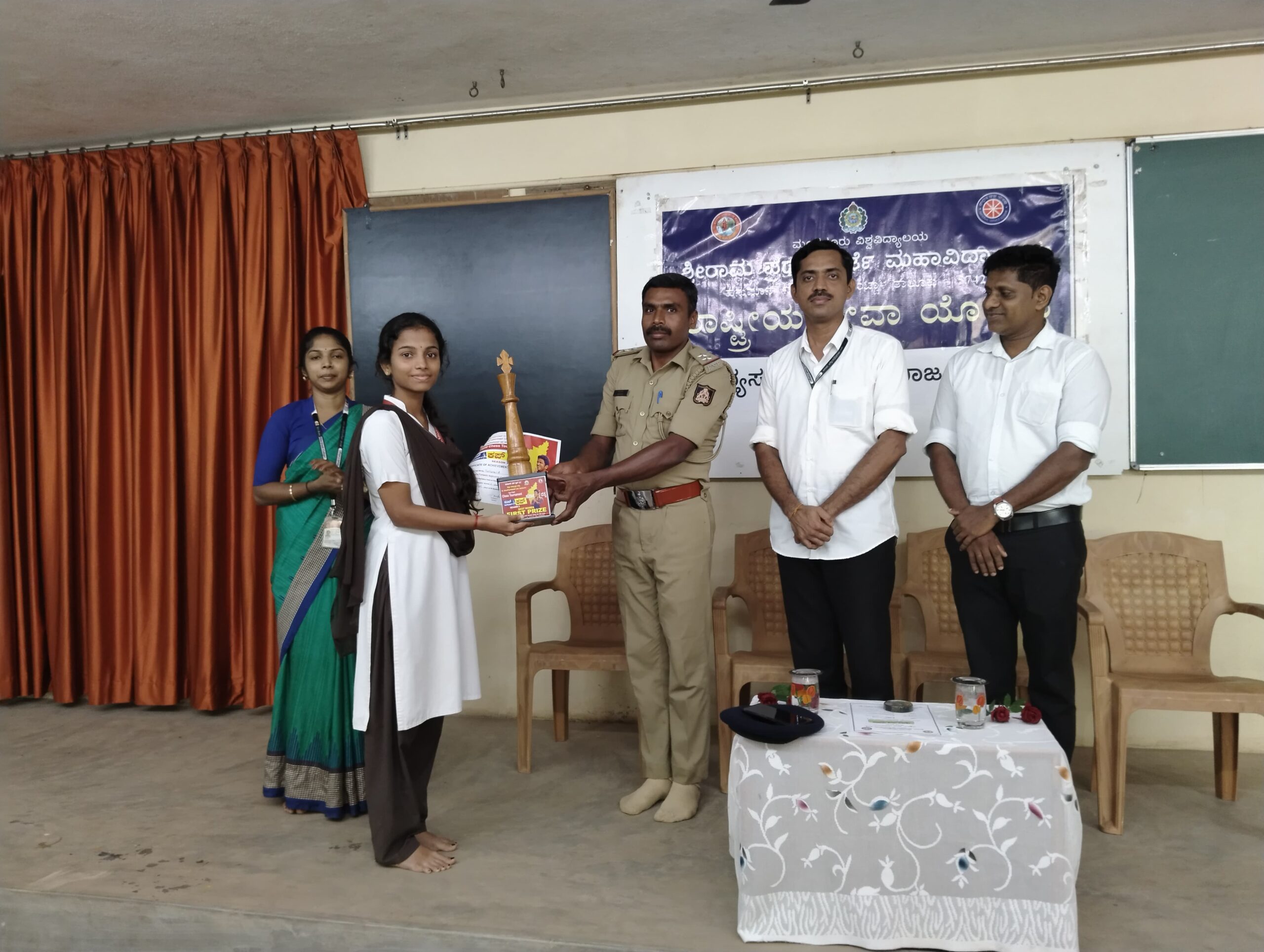 ಈ ಪ್ರಶಸ್ತಿ ಪತ್ರವನ್ನು ಶ್ರೀರಾಮ ಪ್ರಥಮದರ್ಜೆ ಕಾಲೇಜಿನ ಕಾರ್ಯಕ್ರಮವೊಂದಕ್ಕೆ ಅತಿಥಿಗಳಾಗಿ ಆಗಮಿಸಿದ ಬಂಟ್ವಾಳ ಗ್ರಾಮಾಂತರ ಆರಕ್ಷಕ ಠಾಣೆಯ ಉಪನಿರೀಕ್ಷಕರಾಗಿರುವ ಶ್ರೀ ಮೂರ್ತಿ ಇವರು ವಿದ್ಯಾರ್ಥಿನಿಯಾದ ಕು| ಯಶಸ್ವಿ ಇವರಿಗೆ ಪ್ರಶಸ್ತಿ ಪತ್ರ ಹಾಗೂ ಟ್ರೋಫಿಯನ್ನು ಕೊಟ್ಟು ಗೌರವಿಸಿದರು.