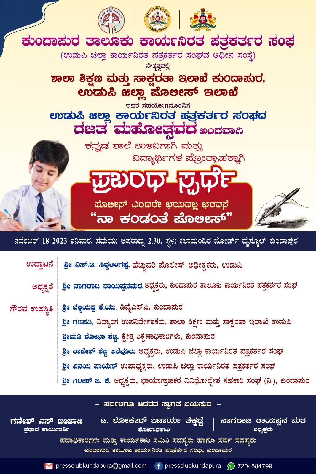 ಕುಂದಾಪುರ ತಾಲೂಕು ಕಾರ್ಯನಿರತ ಪತ್ರಕರ್ತರ ಸಂಘದ ನೇತೃತ್ವದಲ್ಲಿ ನ.18ರಂದು ಕುಂದಾಪುರದಲ್ಲಿ ‘ನಾ ಕಂಡoತೆ ಪೊಲೀಸ್’ ಪ್ರಬಂಧ ಸ್ಪರ್ಧೆ – ಕಹಳೆ ನ್ಯೂಸ್