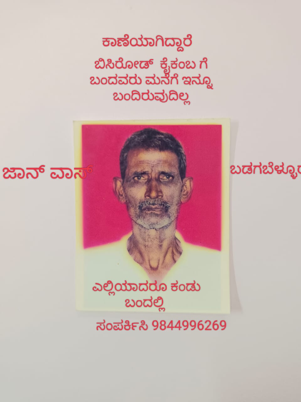 ಕಾವಳಪಡೂರು ಗ್ರಾಮದ ವಗ್ಗ ಸಮೀಪದ ಕೆಲೆಂಜಿಕೋಡಿ ಮಾಂಗಜೆ ನಿವಾಸಿ ಜಾನ್ ವಾಸ (88) ಕಾಣೆಯಾದ ವ್ಯಕ್ತಿ. ಡಿ.6 ರಂದು ಮಗ ಲೆಸ್ಲಿ ಡಿ.ಸೋಜ ಅವರು ಅಡಿಕೆ ಮಾರಾಟ ಮಾಡುವ ಉದ್ದೇಶದಿಂದ ಬಿಸಿರೋಡಿನ ಕೈಕಂಬಕ್ಕೆ ಬಂದಿದ್ದು ಅವರ ಜೊತೆಯಲ್ಲಿ ಇವರ ತಂದೆಯವರನ್ನು ಕರೆದುಕೊಂಡು ಬಂದಿದ್ದರು.