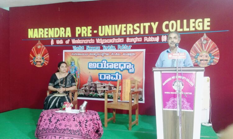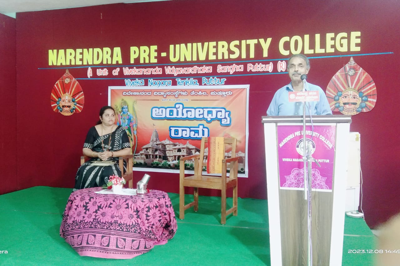 ಅಯೋಧ್ಯೆ ರಾಮಮಂದಿರ ನಿರ್ಮಾಣ ಕುರಿತು ಎಲ್ಲೆಡೆ ನಡೆದ ಹೋರಾಟ, ರಾಮರಥಯಾತ್ರೆಗಳು, ಅಯೋಧ್ಯೆ ಚಲೋ ಮತ್ತು ಕರಸೇವೆಗಳಲ್ಲಿ ಭಾಗವಹಿಸಿದ ಅವಿಸ್ಮರಣೀಯ ಅನುಭವವನ್ನು ಹಂಚಿಕೊಂಡರು. ವೇದಿಕೆಯಲ್ಲಿ ಪುತ್ತೂರಿನ ಉದ್ಯಮಿಗಳಾದ ಶ್ರೀಮತಿ ದೀಪಾ ನಾಯಕ್ ರವರು ಉಪಸ್ಥಿತರಿದ್ದರು. ಕಾರ್ಯಕ್ರಮದಲ್ಲಿ ನರೇಂದ್ರ ಪ.ಪೂ. ಕಾಲೇಜಿನ ಆಡಳಿತ ಮಂಡಳಿಯ ಅಧ್ಯಕ್ಷರಾದ ಶ್ರೀಕಾಂತ ಕೊಳತ್ತಾಯ, ಸಂಚಾಲಕರಾದ ಸಂತೋಷ ಬಿ., ಸದಸ್ಯರಾದ ಸಂಪತ್ ಕುಮಾರ್, ಶಿಕ್ಷಕವೃಂದ ಮತ್ತು ವಿದ್ಯಾರ್ಥಿಗಳು ಭಾಗವಹಿಸಿದ್ದರು.