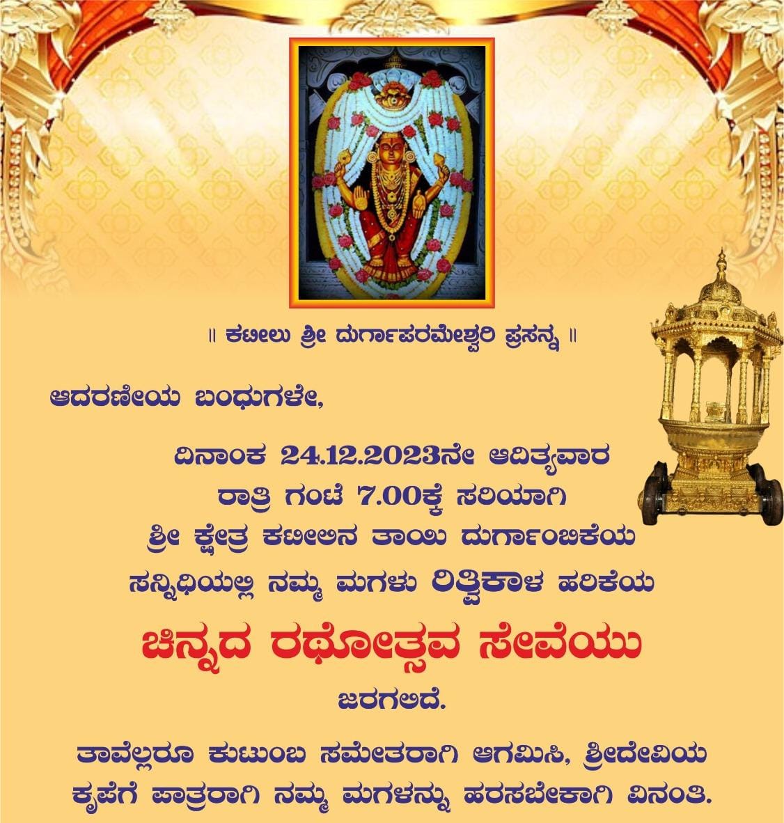 ಖ್ಯಾತ ಯಕ್ಷಗಾನ ಭಾಗವತ ಯಕ್ಷ ಧ್ರುವ ಪಟ್ಲ ಸತೀಶ್ ಶೆಟ್ಟಿಯವರ ಮಗಳು ರಿತ್ವಿಕಾಳ ಹರಿಕೆಯ ” ಚಿನ್ನದ ರಥೋತ್ಸವ ಸೇವೆ ” ಇಂದು ಡಿ. 24ರ ಆದಿತ್ಯವಾರ ರಾತ್ರಿ 7ಕ್ಕೆ ಸರಿಯಾಗಿ ಶ್ರೀ ಕ್ಷೇತ್ರ ಕಟೀಲಿನ ತಾಯಿ ದುರ್ಗಾಂಬಿಕೆಯ ಸನ್ನದಿಯಲ್ಲಿ ಜರಗಲಿದೆ.