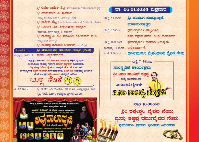 ಜ.03ರಿಂದ ಜ.05ರ ತನಕ ವಿವಿಧ ಸಾಂಸ್ಕೃತಿಕ, ಧಾರ್ಮಿಕ ಹಾಗೂ ವಿವಿಧ ಕಾರ್ಯಕ್ರಮಗಳು ನಡೆಯಲಿದ್ದು, ಜ.05ರಂದು ಮೈಸಂದಾಯ, ರಕೇಶ್ವರಿ ಮತ್ತು ಅಣ್ಣಪ್ಪ ಧರ್ಮ ದೈವಗಳ ನೇಮೋತ್ಸವ ನಡೆಯಲಿದೆ.
