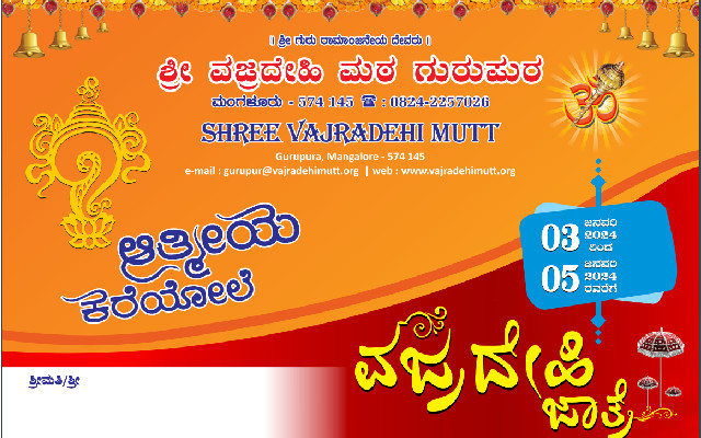ಮಂಗಳೂರು : ಗುರುಪುರ ಶ್ರೀ ವಜ್ರದೇಹಿ ಮಠದ “ವಜ್ರದೇಹಿ ಜಾತ್ರೆ” ಯು ಜ.03ರಿಂದ ಜ.05ರ ವರೆಗೆ ನಡೆಯಲಿದೆ.