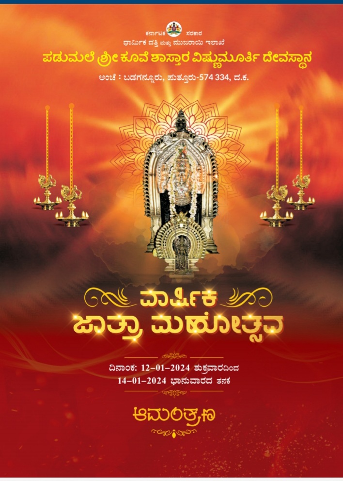 ಪುತ್ತೂರು : ಜ.12 ರಿಂದ 14ರ ವರೆಗೆ ಶ್ರೀ ಕ್ಷೇತ್ರ ಪಡುಮಲೆ ಕೂವೆ ಶಾಸ್ತಾರ ವಿಷ್ಣುಮೂರ್ತಿ ದೇವಾಲಯದಲ್ಲಿ ವಾರ್ಷಿಕ ಜಾತ್ರಾ ಮಹೋತ್ಸವವು ಪೂರ್ವ ಸಂಪ್ರದಾಯದoತೆ ಜರಗಲಿರುವುದು.