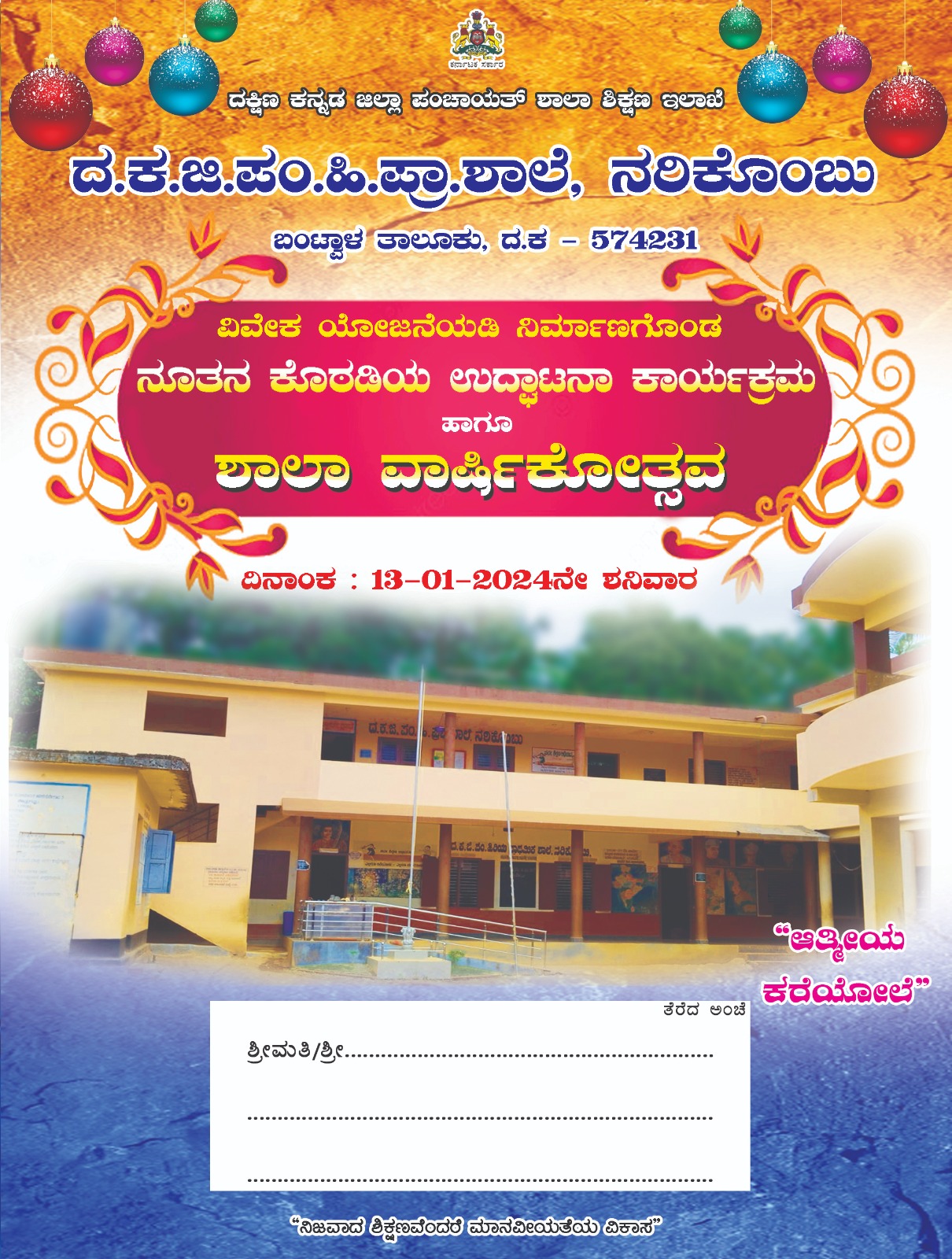 ಬಂಟ್ವಾಳ : ಜ.13ರಂದು ನರಿಕೊಂಬು ಗ್ರಾಮದ ಸರಕಾರಿ ಹಿರಿಯ ಪ್ರಾಥಮಿಕ ಶಾಲೆಯ ವಿವೇಕ ತರಗತಿ ಕೊಠಡಿ ಉದ್ಘಾಟನೆ ಹಾಗೂ ಶಾಲಾ ವಾರ್ಷಿಕೋತ್ಸವ ಕಾರ್ಯಕ್ರಮ – ಕಹಳೆ ನ್ಯೂಸ್