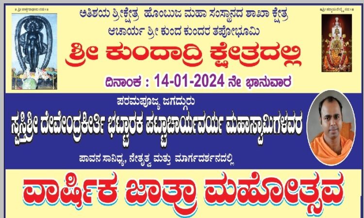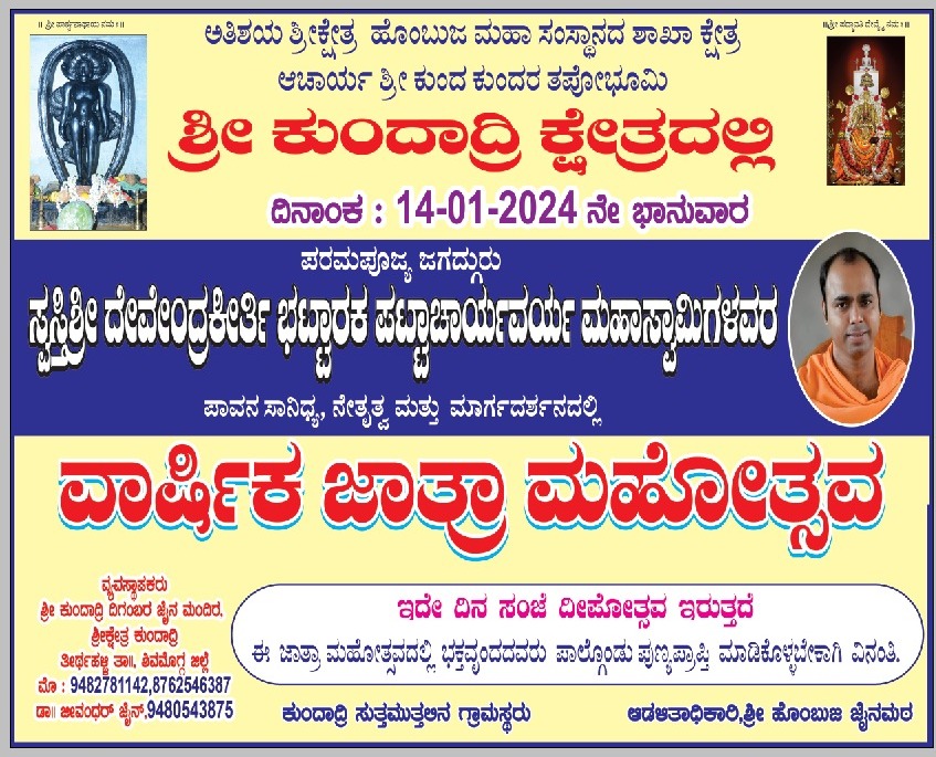 ತೀರ್ಥಹಳ್ಳಿ : ಅತಿಶಯ ಶ್ರೀ ಕ್ಷೇತ್ರ ಹೊಂಬುಜ ಜೈನ ಮಠದ ಶಾಖಾ ಕ್ಷೇತ್ರ ಅಚಾರ್ಯ ಶ್ರೀ ಕುಂದ ಕುಂದಾಚಾರ್ಯ ತಪೋಭೂಮಿ ಶ್ರೀಕ್ಷೇತ್ರ ಕುಂದಾದ್ರಿಯಲ್ಲಿ ಜ.14ರಂದು ಭಗವಾನ್ ಶ್ರೀ 1008 ಪಾಶ್ರ್ವನಾಥ ಸ್ವಾಮಿ ಹಾಗೂ ಜಗನ್ಮಾತೆ ಶ್ರೀಪದ್ಮಾವತಿ ಅಮ್ಮನವರ ವಾರ್ಷಿಕ ಜಾತ್ರ ಮಹೋತ್ಸವ ನಡೆಯಲಿದೆ.