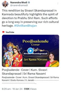 ಶಿವಶ್ರೀ ಹಾಡಿರುವ ಸಾಂಗ್ನ ವಿಡಿಯೋ ಲಿಂಕ್ನ ಟ್ವಿಟರ್ನಲ್ಲಿ ಪ್ರಧಾನಿ ಮೋದಿ ಶೇರ್ ಮಾಡಿಕೊಂಡಿದ್ದಾರೆ. ಶಿವಶ್ರೀ ಪ್ರಯತ್ನವನ್ನು ಅವರು ಮೆಚ್ಚಿದ್ದಾರೆ. ಈ ಟ್ವೀಟ್ನ ರೀಟ್ವೀಟ್ ಮಾಡಿಕೊಂಡಿರುವ ಶಿವಶ್ರೀ ಅವರು ಪ್ರಧಾನಿ ಮೋದಿಗೆ ಧನ್ಯವಾದ ಹೇಳಿದ್ದಾರೆ.