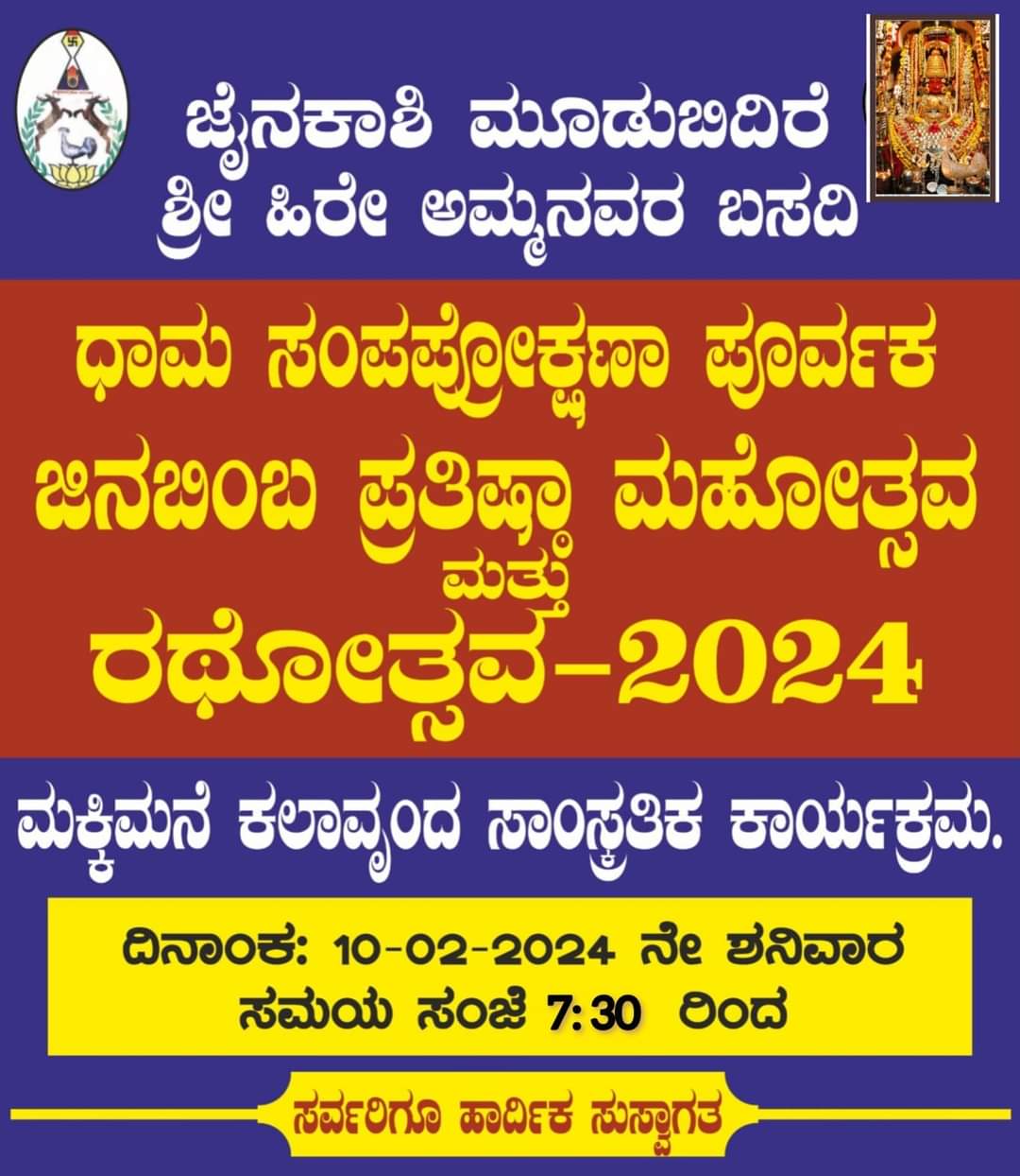 ಮೂಡುಬಿದಿರೆ : ಮೂಡುಬಿದಿರೆ ಜೈನ್ ಪೇಟೆ ಇತಿಹಾಸ ಪ್ರಸಿದ್ದ ಹೀರೆ ಅಮ್ಮನವರ ಬಸದಿ ಧಾಮ ಸಂಪಪ್ರೋಕ್ಷಣಾ ಪೂರ್ವಕ ಜಿನಬಿಂಬ ಪ್ರತಿಷ್ಠಾ ಮಹೋತ್ಸವ ಮತ್ತು ವಾರ್ಷಿಕ ರಥೋತ್ಸವು ಇಂದಿನಿAದ ಫೆ. 16ರ ತನಕ ಜರುಗಲಿದೆ.