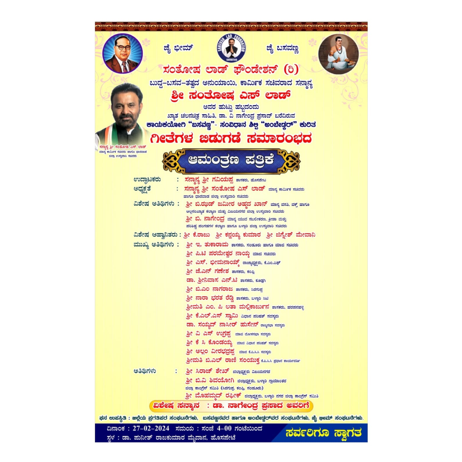 ಒಟ್ಟಿನಲ್ಲಿ ಭೀಮ-ಬಸವ-ಬುದ್ಧ ಅನುಯಾಯಿಯಾದ ಸಚಿವ ಸಂತೋಷ್ ಲಾಡ್ ಅವರ ಹುಟ್ಟುಹಬ್ಬದ ಸಂಭ್ರಮದಲ್ಲಿ ಆಯೋಜನೆಯಾಗಿರುವ ಈ ಅರ್ಥಪೂರ್ಣ ಕಾರ್ಯಕ್ರಮದಲ್ಲಿ ಎಲ್ಲರೂ ಭಾಗಿಯಾಗಿ ಸಚಿವ ಲಾಡ್ ಅವರಿಗೆ ಹುಟ್ಟುಹಬ್ಬದ ಶುಭಾಶಯಗಳನ್ನು ತಿಳಿಸೋಣ.