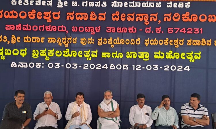ಬಂಟ್ವಾಳ: ಪಾಣೆಮಂಗಳೂರು ಶ್ರೀ ಭಯಂಕೇಶ್ವರ ಸದಾಶಿವ ದೇವಸ್ಥಾನದ ಶ್ರೀಗಣಪತಿ, ಶ್ರೀ ದುರ್ಗಾ ಸಾನಿಧ್ಯಗಳ ಪುನಃಪ್ರತಿಷ್ಠೆಯೊಂದಿಗೆ ಭಯಂಕೇಶ್ವರ ಸದಾಶಿವ ದೇವರಿಗೆ ಅಷ್ಟಬಂಧ ಬ್ರಹ್ಮಕಲಶೋತ್ಸವ ಹಾಗೂ ಜಾತ್ರಾ ಮಹೋತ್ಸವ ಮಾ.3ರಿಂದ ಮೊದಲ್ಗೊಂಡು ಮಾ.12ರವರೆಗೆ ನಡೆಯಲಿದೆ ಎಂದು ವ್ಯವಸ್ಥಾಪನಾ, ಜೀರ್ಣೋದ್ಧಾರ ಸಮಿತಿ ಅಧ್ಯಕ್ಷ ಬಿ.ರಘುನಾಥ ಸೋಮಯಾಜಿ ಎರಕಳ ಹೇಳಿದ್ದಾರೆ.