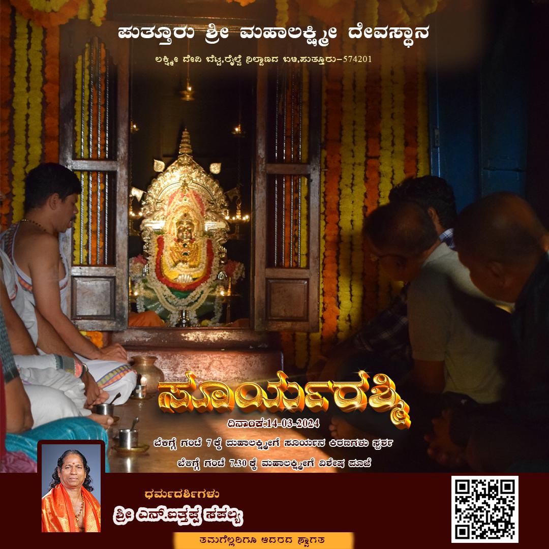 ಕ್ಷೇತ್ರದ ಧರ್ಮದರ್ಶಿ ಐತ್ತಪ್ಪ ಸಪಲ್ಯ ಶ್ರೀ ದೇವಿಗೆ ವಿಶೇಷ ಪೂಜೆ ಸಲ್ಲಿಸಲಿದ್ದು, ವರ್ಷದ ಕೊನೆಯ ಮಾಸವಾಗಿರುವ ಮೀನ ಸಂಕ್ರಮಣದಂದು ಸೂರ್ಯ ತನ್ನ ಪಥ ಬದಲಿಸುವ ಮಹತ್ವದ ಘಟ್ಟ. ಮೀನ ಸಂಕ್ರಮಣದಂದು ಸೂರ್ಯನ ರಶ್ಮಿ ದೇವಳದ ಗರ್ಭಗುಡಿಗೆ ಸ್ಪರ್ಶಿಸುವ ಪುಣ್ಯದಿನ. ಬೆಂಗಳೂರಿನ ಗವಿಗಂಗಾಧರೇಶ್ವರ ದೇವಸ್ಥಾನ ಹೊರತು ಪಡಿಸಿದರೆ ಸೂರ್ಯನ ರಶ್ಮಿಯು ಬಿಂಬವನ್ನು ಸ್ಪರ್ಶಿಸುವ ರಾಜ್ಯದ ಎರಡನೇ ದೇವಸ್ಥಾನ ಪುತ್ತೂರಿನ ಲಕ್ಷ್ಮೀದೇವಿ ಬೆಟ್ಟದ ಮಹಾಲಕ್ಷ್ಮೀ ಕ್ಷೇತ್ರವಾಗಿದೆ.