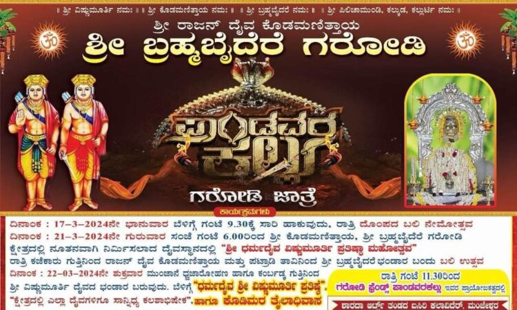ಬಂಟ್ವಾಳ : ಶ್ರೀ ಕೊಡಮಣಿತ್ತಾಯ, ಶ್ರೀ ಬ್ರಹ್ಮಬೈದೆರೆ ಗರೋಡಿ ಕ್ಷೇತ್ರದಲ್ಲಿ ನೂತನವಾಗಿ ನಿರ್ಮಿಸಲಾದ ದೈವಸ್ಥಾನದಲ್ಲಿ “ಶ್ರೀ ಧರ್ಮದೈವ ವಿಷ್ಣುಮೂರ್ತಿ ಪ್ರತಿಷ್ಠಾ ಮಹೋತ್ಸವ” 21ರ ಗುರುವಾರ ನಡೆಯಲಿದ್ದು, ರಾತ್ರಿ ಕಜೆಕಾರು ಗುತ್ತಿನಿಂದ ರಾಜನ್ ದೈವ ಕೊಡಮಣಿತ್ತಾಯ ಮತ್ತು ಪಟ್ರಾಡಿ ತಾವಿನಿಂದ ಶ್ರೀ ಬ್ರಹ್ಮಬೈದರೆ ಭಂಡಾರ ಬಂದು ಬಲಿ ಉತ್ಸವ ನಡೆಯಲಿದೆ.