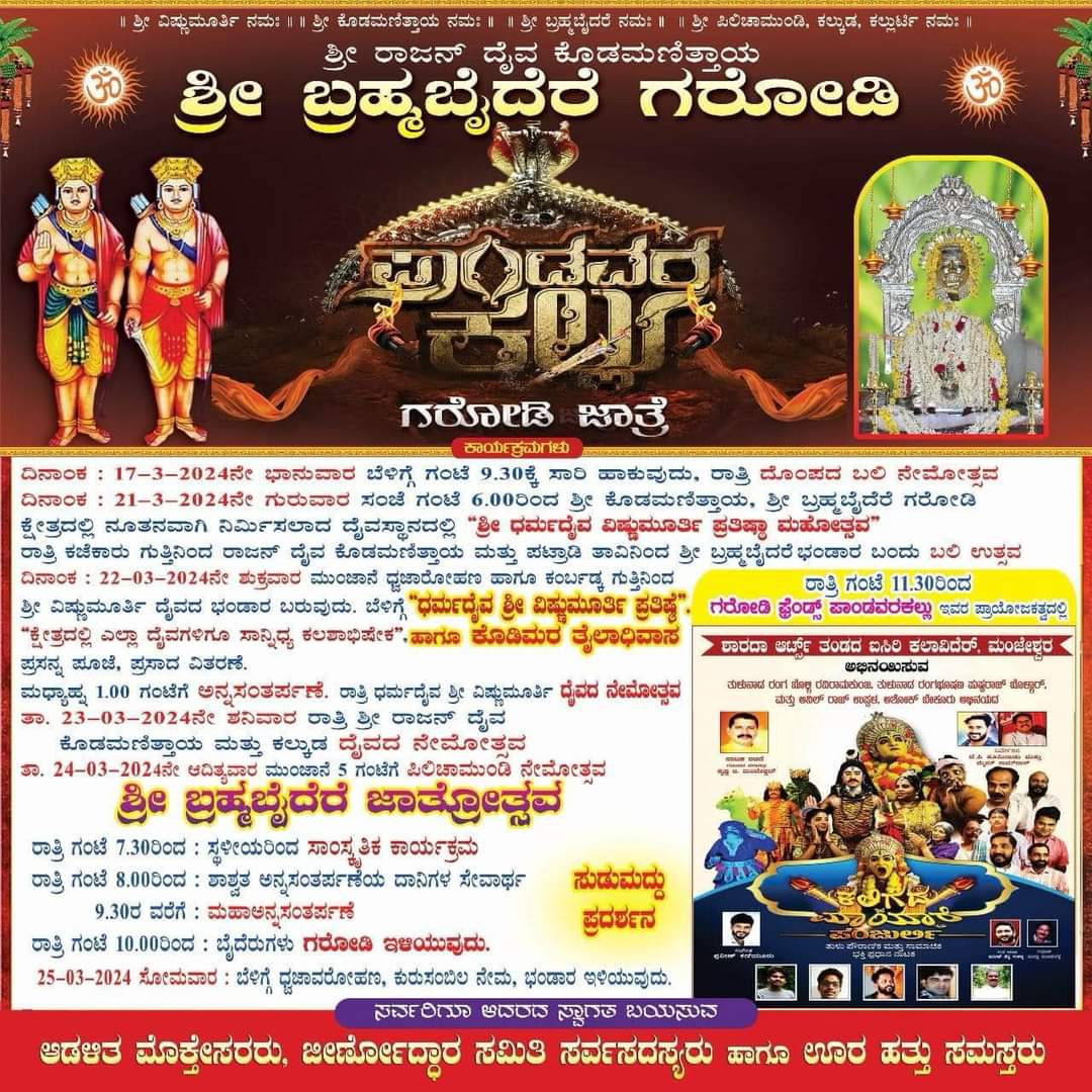 ತದನಂತರ 23ರ ರಾತ್ರಿ ಶ್ರೀ ರಾಜನ್ ದೈವಕೊಡಮಣಿತ್ತಾಯ ಮತ್ತು ಕಲ್ಕುಡ ದೈವದ ನೇಮೋತ್ಸವ. 24ರಂದು ಆದಿತ್ಯವಾರ ಮುಂಜಾನೆ 5 ಗಂಟೆಗೆ ಪಿಲಿಚಾಮುಂಡಿ ನೇಮೋತ್ಸವ ರಾತ್ರಿ ಶ್ರೀ ಬ್ರಹ್ಮಬೈದೆರೆ ಜಾತ್ರೋತ್ಸವ ಮತ್ತು ಸ್ಥಳೀಯರಿಂದ ಸಾಂಸ್ಕೃತಿಕ ಕಾರ್ಯಕ್ರಮ ಗರೋಡಿ ಫ್ರೆಂಡ್ಸ್ ಪಾಂಡವರಕಲ್ಲು ಇವರ ಪ್ರಾಯೋಜಕತ್ವದಲ್ಲಿ ಶಾರದಾ ಆರ್ಟ್ಸ್ ತಂಡದ ಐಸಿರಿ ಕಲಾವಿದೆರ್, ಮಂಜೇಶ್ವರವರ ವತಿಯಿಂದ ವಿವಿಧ ಕಾರ್ಯಕ್ರಮಗಳು ಮತ್ತು ಸುಡುಮದ್ದು ಪ್ರದರ್ಶನ ನಡೆದ ಬಳಿಕ ಮಹಾಅನ್ನಸಂತರ್ಪಣೆ ಜರುಗಲಿದೆ.