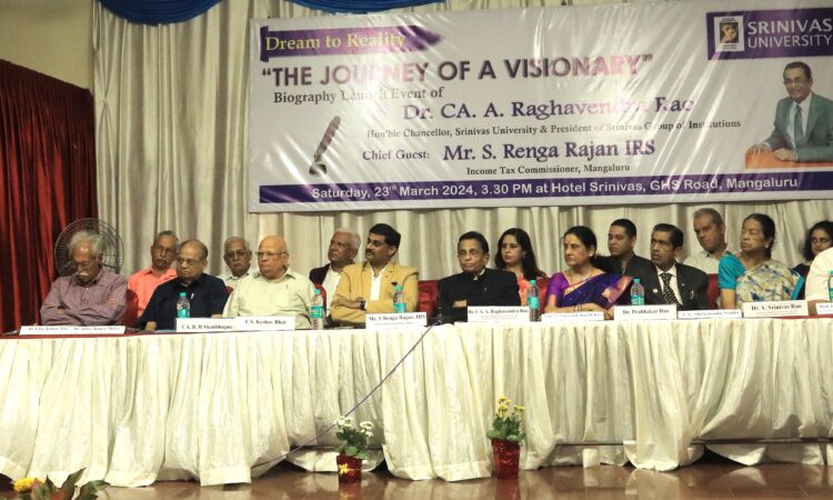 ಮಂಗಳೂರು: ಶ್ರೀನಿವಾಸ ವಿಶ್ವವಿದ್ಯಾಲಯವು ಗೌರವಾನ್ವಿತ ಕುಲಾಧಿಪತಿ ಡಾ.ಸಿಎ.ಎ ರಾಘವೇಂದ್ರ ರಾವ್ ಅವರ ಗಮನಾರ್ಹ ಜೀವನವನ್ನು ವಿವರಿಸುವ ಜೀವನಚರಿತ್ರೆ ಡ್ರೀಮ್ ಟು ರಿಯಾಲಿಟಿ – “ದ ಜರ್ನಿ ಆಫ್ ಎ ವಿಜನರಿ” ಬಿಡುಗಡೆಯನ್ನು ಆಯೋಜಿಸಿತ್ತು. ಮಂಗಳೂರಿನ ಹೊಟೇಲ್ ಶ್ರೀನಿವಾಸ್ ನಲ್ಲಿ ಮಾರ್ಚ್ 23, ರಂದು ಕಾರ್ಯಕ್ರಮ ನಡೆಯಿತು.
