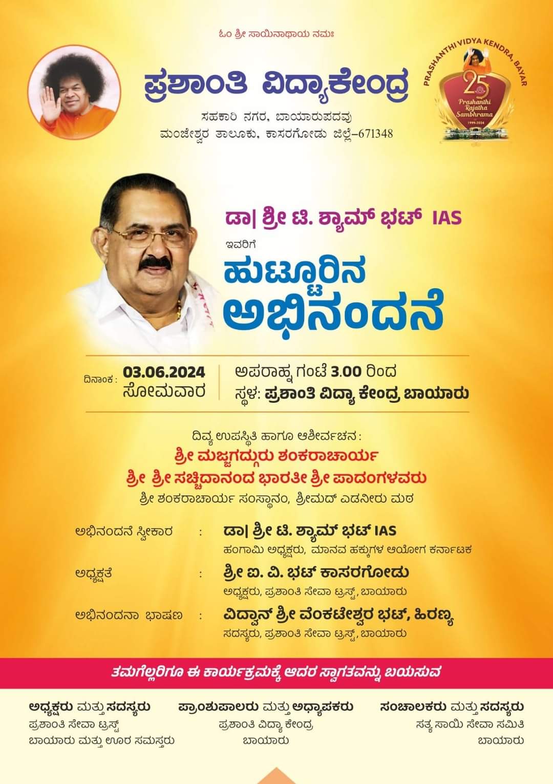 ಬಾಯಾರು ಪ್ರಶಾಂತಿ ಸೇವಾ ಟ್ರಸ್ಟ್ ವತಿಯಿಂದ ಜೂ.03ರಂದು ಡಾ| ಶ್ರೀ ಟಿ. ಶ್ಯಾಮ್ ಭಟ್ IAS ಇವರಿಗೆ ಹುಟ್ಟೂರಿನ ಅಭಿನಂದನೆ – ಕಹಳೆ ನ್ಯೂಸ್