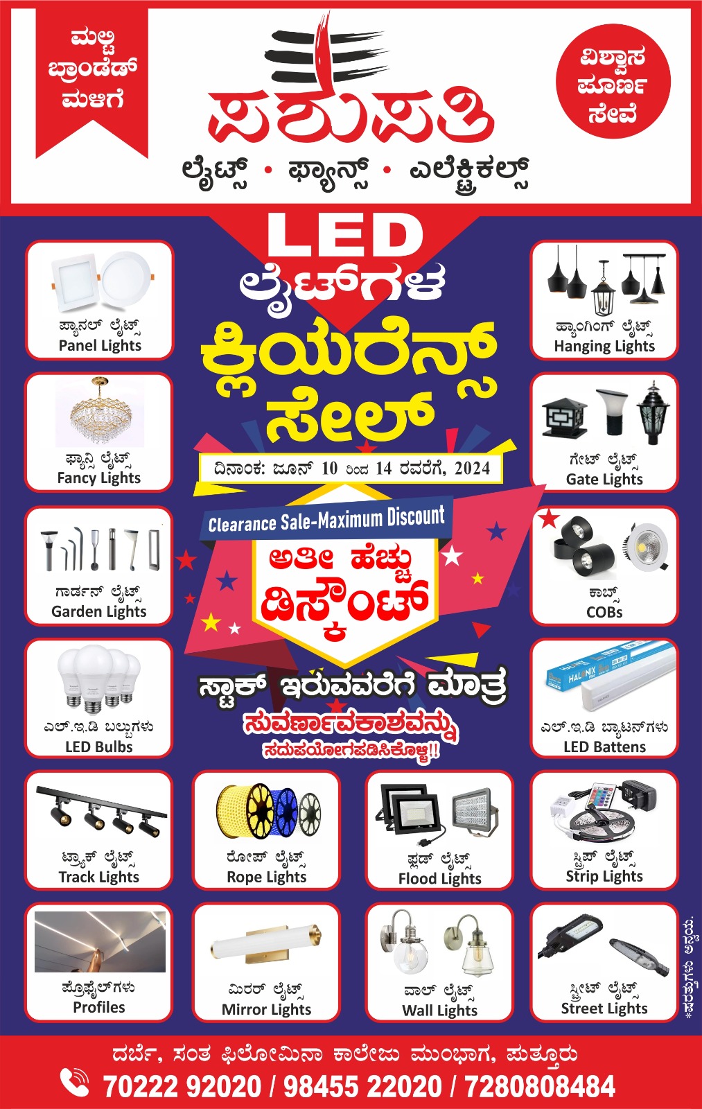 ದರ್ಬೆಯ ಫಿಲೋಮಿನ ಕಾಲೇಜ್ ನ ಮುಂಭಾಗದಲ್ಲಿರುವ ಪಶುಪತಿ ಲೈಟ್ಸ್ ಎಲೆಕ್ಟ್ರಿಕಲ್ಸ್ ನಲ್ಲಿ ಜೂನ್ 10 ರಿಂದ 14 ರವರೆಗೆ ಅತೀ ಹೆಚ್ಚು ಡಿಸ್ಕೌಂಟ್ ನೊಂದಿಗೆ ಕ್ಲಿಯರೆನ್ಸ್ ಸೇಲ್ ಹಮ್ಮಿಕೊಳ್ಳಲಾಗಿದೆ.