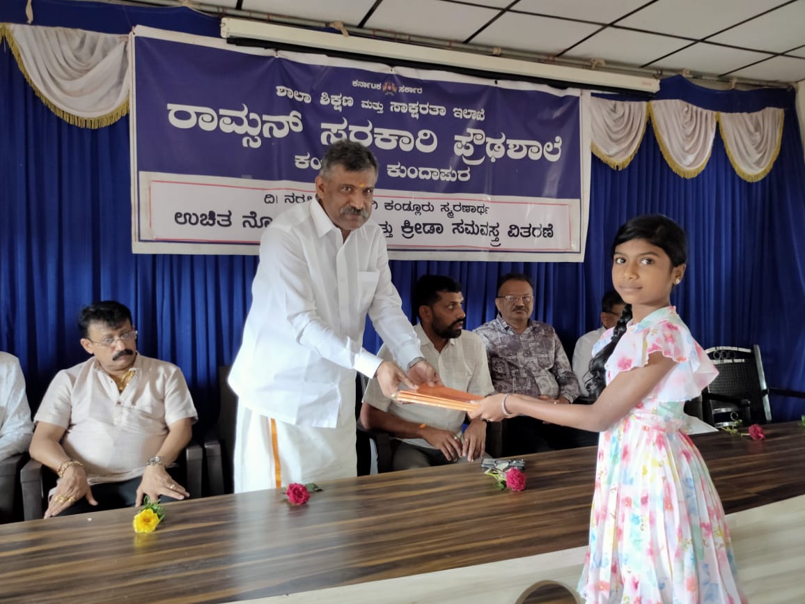 ರಾಮ್ಸನ್ ಸರ್ಕಾರಿ ಪ್ರೌಢಶಾಲೆ ಕಂಡ್ಲೂರು ಇಲ್ಲಿಯ ವಿದ್ಯಾರ್ಥಿಗಳಿಗೆ ತಮ್ಮ ತಂದೆ ತಾಯಿಯ ಸವಿನೆಪಿನಲ್ಲಿ ಪ್ರತಿ ವರ್ಷ ನೀಡುವ ಉಚಿತ ನೋಟ್ ಪುಸ್ತಕ, ಕ್ರೀಡಾ ಸಮವಸ್ತ್ರ ಹಾಗೂ ಪ್ರತಿಭಾವಂತ ವಿದ್ಯಾರ್ಥಿಗಳಿಗೆ ನಗದು ಬಹುಮಾನ ನೀಡಿ ಅಭಿನಂದಿಸಿ , ವಿದ್ಯಾರ್ಥಿಗಳನ್ನು ಉದ್ದೇಶಿಸಿ ಮಾತನಾಡಿದರು.