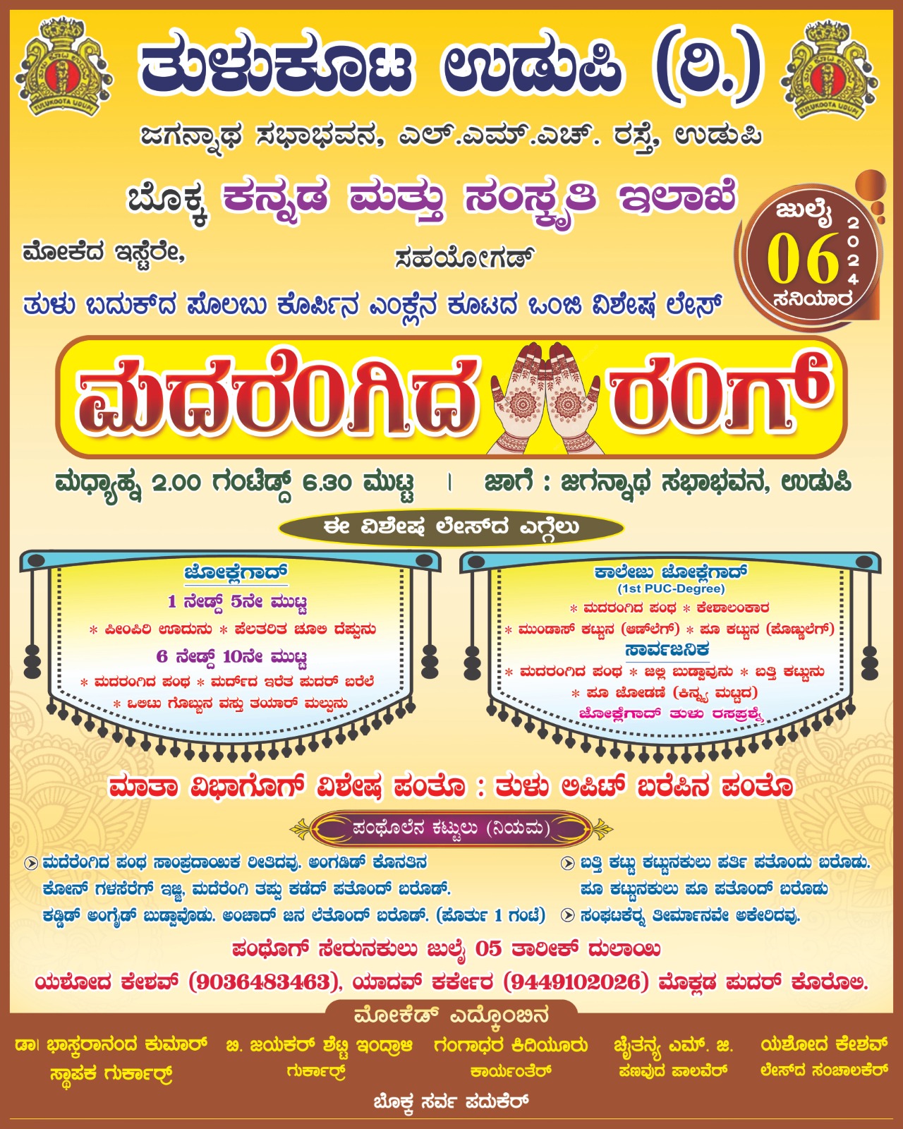 ಉಡುಪಿ: ಜು.6: ತುಳುಕೂಟ ಉಡುಪಿ ವತಿಯಿಂದ “ಮದರೆಂಗಿದರAಗ್”*ಉಡುಪಿ ಜಿಲ್ಲಾ ಶಾಲಾ-ಕಾಲೇಜು ಮಕ್ಕಳಿಗೆ ಹಾಗೂ ಸಾರ್ವಜನಿಕರಿಗೆ ತುಳು ಸಾಂಪ್ರದಾಯಿಕ ಸ್ಪರ್ಧೆ..-ಕಹಳೆ ನ್ಯೂಸ್