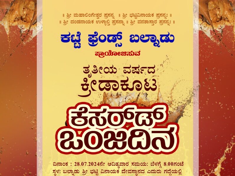 ಪುತ್ತೂರು : ಕಟ್ಟೆ ಫ್ರೆಂಡ್ಸ್ ಬಲ್ನಾಡು ಇವರ ಆಶ್ರಯದಲ್ಲಿ ಜು.28ರಂದು ತೃತೀಯ ವರ್ಷದ ಕೆಸರ್ಡ್ ಒಂಜಿ ದಿನ-2024 ಕೆಸರುಗದ್ದೆ ಕ್ರೀಡಾಕೂಟ – ಕಹಳೆ ನ್ಯೂಸ್
