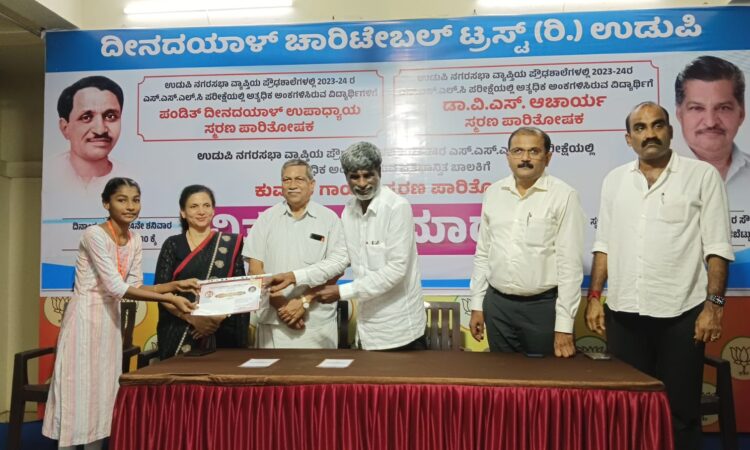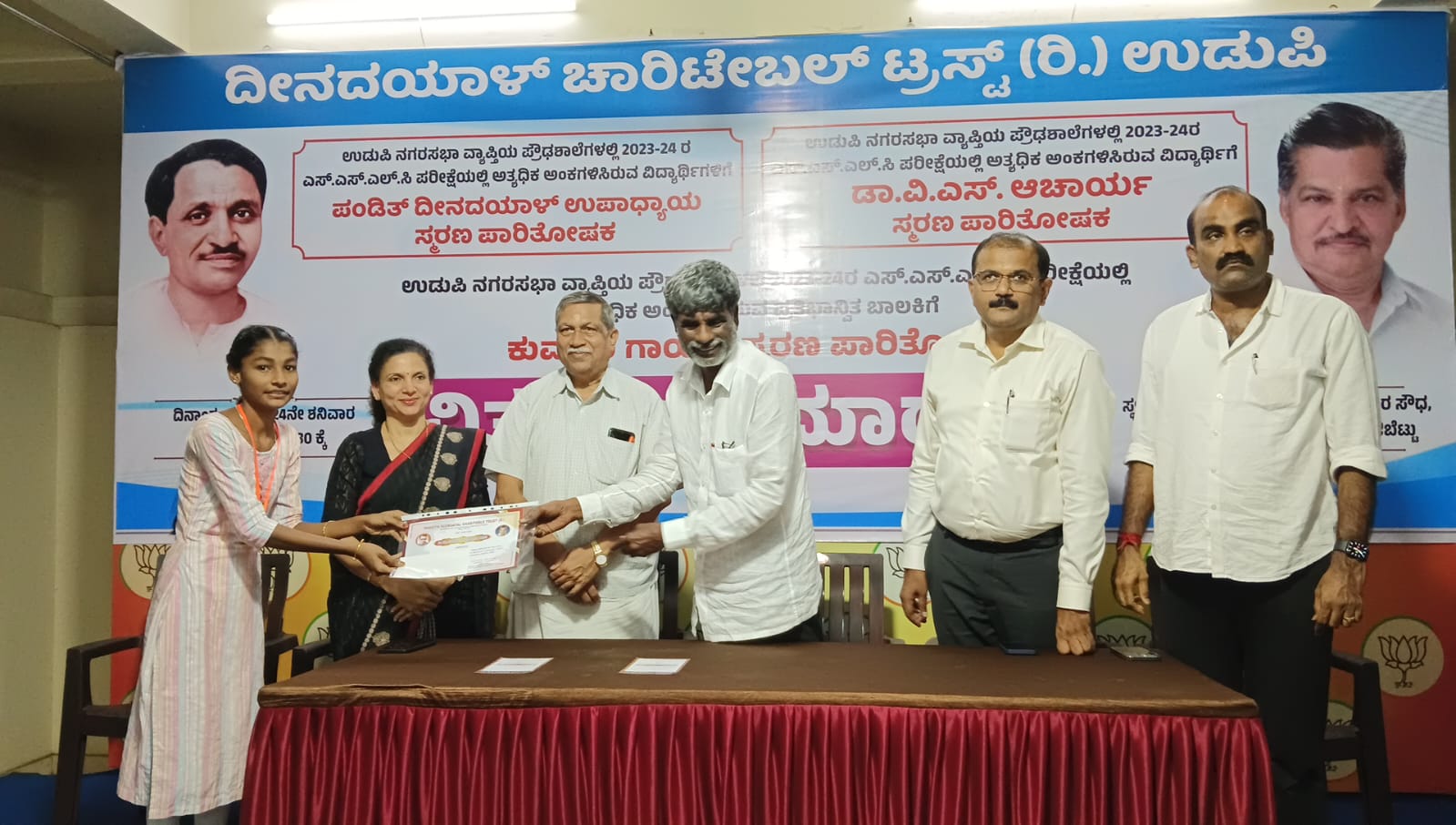 ಅವರು ದೀನದಯಾಳ್ ಚಾರಿಟೇಬಲ್ ಟ್ರಸ್ಟ್(ರಿ.) ವತಿಯಿಂದ ನಗರಸಭಾ ವ್ಯಾಪ್ತಿಯ ಪ್ರೌಢಶಾಲೆಗಳಲ್ಲಿ ಎಸೆಸೆಲ್ಸಿಯಲ್ಲಿ ಅತಿಹೆಚ್ಚು ಅಂಕ ಗಳಿಸಿದ ವಿದ್ಯಾರ್ಥಿಗಳಿಗೆ ‘ಪಂಡಿತ್ ದೀನದಯಾಳ್ ಉಪಾಧ್ಯಾಯ ಸ್ಮರಣ ಪಾರಿತೋಷಕ’ ಹಾಗೂ ‘ಡಾ! ವಿ.ಎಸ್. ಆಚಾರ್ಯ ಸ್ಮರಣ ಪಾರಿತೋಷಕ’ ಮತ್ತು ಅತಿ ಹೆಚ್ಚು ಅಂಕಗಳಿಸಿದ ವಿದ್ಯಾರ್ಥಿನಿಯೊಬ್ಬಳಿಗೆ ‘ಕುಮಾರಿ ಗಾಯತ್ರಿ ಸ್ಮರಣ ಪಾರಿತೋಷಕ’ ನೀಡಿ ಗೌರವಿಸಿ ಶುಭ ಹಾರೈಸಿದರು.