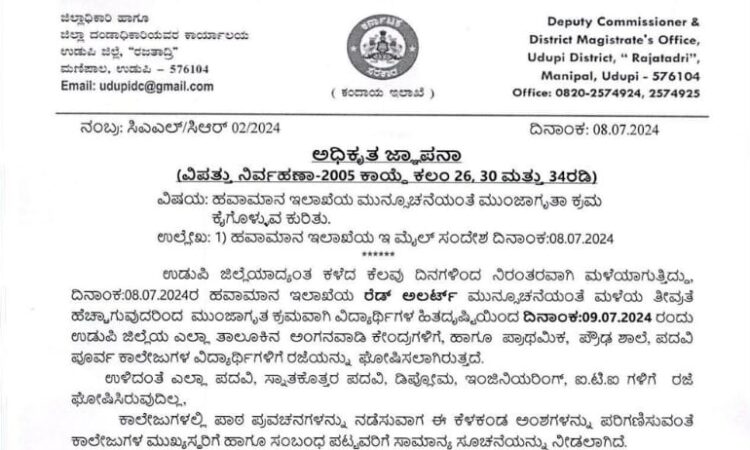 ಉಡುಪಿ ಜಿಲ್ಲೆಯಾದ್ಯಂತ ಸುರಿಯುತ್ತಿರುವ ಭಾರೀ ಮಳೆಯ ಹಿನ್ನೆಲೆ ಹವಾಮಾನ ಇಲಾಖೆಯಿಂದ ರೆಡ್ ಅಲರ್ಟ್ ಘೋಷಣೆಯಾಗಿರುವುದರಿಂದ ಮುಂಜಾಗ್ರತಾ ಕ್ರಮವಾಗಿ ಜು.9ರಂದು ಉಡುಪಿ ಜಿಲ್ಲೆಯ ಶಾಲಾ ಕಾಲೇಜುಗಳಿಗೆ ರಜೆ ಘೋಷಿಸಲಾಗಿದೆ.