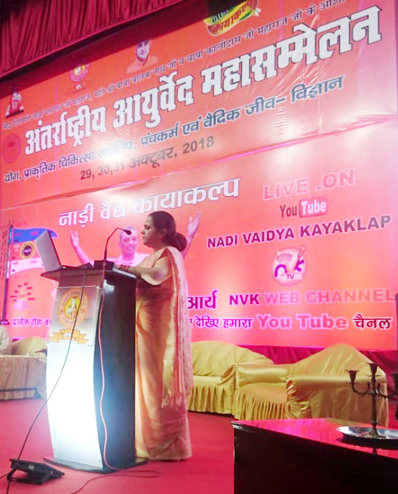 ಅವರು ರೊಹತಕ, ಹರಿಯಾಣಾದಲ್ಲಿ ಅಕ್ಟೋಬರ್ 29 ರಿಂದ 31 ರ ಕಾಲಾವಧಿಯಲ್ಲಿ ಜರುಗಿದ ‘ಆಯರ್ವೇದ, ಯೋಗ. ವೈದ್ಯಕೀಯ, ಜ್ಯೋತಿಷಶಾಸ್ತ್ರ, ಪಂಚರ್ಮ, ನ್ಯಾಚರೋಪಥಿ, ವೈದಿಕ ಸೂಕ್ಷ್ಮ-ಜೀವಶಾಸ್ತ್ರ ಮತ್ತು ಇತರ ಜೀವ ಶಾಸ್ತ್ರದ ಬಗ್ಗೆ ಅಂತರಾಷ್ಟ್ರೀಯ ಪರಿಷತ್ತಿನಲ್ಲಿಯ ಕೊನೆಯ ಸಮಾರೋಪದಲ್ಲಿ ಮುಖ್ಯವಕ್ತಾರ (‘ಕೀ ನೋಟ್ ಸ್ಪೀಕರ) ಎಂದು ಮಾತನಾಡಿದರು. ಅವರು ‘ಆಯರ್ವೇದದಲ್ಲಿಯ ಭೂತವಿದ್ಯೆಯ ವಿಷಯದಲ್ಲಿಯ ಸಂಶೋಧನೆ – ನಕಾರಾತ್ಮಕ ಪ್ರಭಾವದಿಂದ ರಕ್ಷಣೆಯನ್ನು ಮಾಡುವ ನೈರ್ಗಿಕ ಘಟಕ’ ಈ ಆಧ್ಯಾತ್ಮಿಕ ಶೋಧಪ್ರಬಂಧವನ್ನು ಮಂಡಿಸಿದರು.