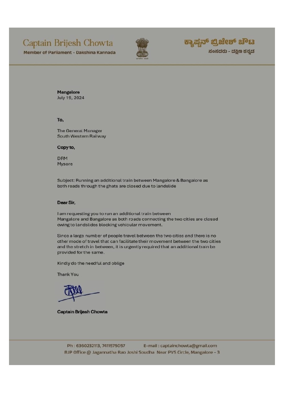 ವ್ಯಾಪಕ ಮಳೆಯಿಂದಾಗಿ ಮಂಗಳೂರು ಮತ್ತು ಬೆಂಗಳೂರನ್ನು ಸಂಪರ್ಕಿಸುವ ಮುಖ್ಯ ಎರಡೂ ರಾಷ್ಟೀಯ ಹೆದ್ದಾರಿಗಳಲ್ಲಿ ಗುಡ್ಡ ಕುಸಿತದಿಂದ ವಾಹನ ಸಂಪರ್ಕ ಕಡಿತವಾಗಿರುವ ಹಿನ್ನೆಲೆಯಲ್ಲಿ ದಕ್ಷಿಣ ಕನ್ನಡ ಸಂಸದರಾದ ಕ್ಯಾಪ್ಟನ್ ಬ್ರಿಜೇಶ್ ಚೌಟ ಅವರು ನೈಋತ್ಯ ರೈಲ್ವೆ ಜನರಲ್ ಮ್ಯಾನೇಜರ್ ಮತ್ತು ಮೈಸೂರು ಡಿಆರ್ಎಮ್ ಅವರಿಗೆ ಮಂಗಳೂರು- ಬೆಂಗಳೂರು ನಡುವೆ ಹೆಚ್ಚುವರಿ ರೈಲು ಸೇವೆಯನ್ನು ತುರ್ತಾಗಿ ಪ್ರಾರಂಭಿಸುವಂತೆ ಪತ್ರ ಬರೆದು ವಿನಂತಿಸಿದ್ದಾರೆ.