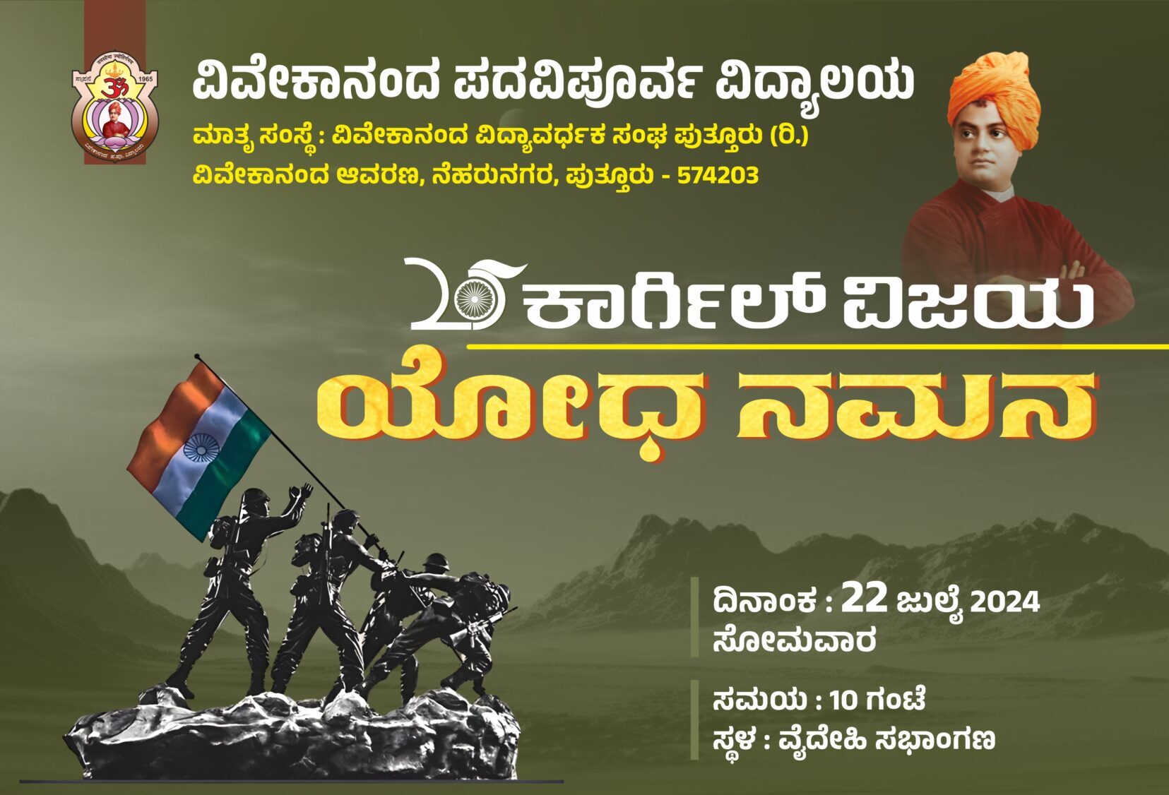 ಪುತ್ತೂರು : ಕಾರ್ಗಿಲ್ ಯುದ್ಧದಲ್ಲಿ ಭಾರತ ವಿಜಯ ಸಾಧಿಸಿ 25 ವರ್ಷಗಳು ಪೂರೈಸಿದ ಹಿನ್ನೆಲೆಯಲ್ಲಿ ವಿವೇಕಾನಂದ ಪದವಿಪೂರ್ವ ಕಾಲೇಜಿನಲ್ಲಿ ಕಾರ್ಗಿಲ್ ವಿಜಯ – ಯೋಧ ನಮನ ಕಾರ್ಯಕ್ರಮವು ಜು. 22ರಂದು ವಿವೇಕಾನಂದ ಪದವಿಪೂರ್ವ ಕಾಲೇಜಿನ ವೈದೇಹಿ ಸಭಾಂಗಣದಲ್ಲಿ ನಡೆಯಲಿದೆ.