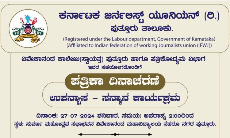 ಪುತ್ತೂರು : ಕರ್ನಾಟಕ ಜರ್ನಲಿಸ್ಟ್ ಯೂನಿಯನ್ (ರಿ) ಪುತ್ತೂರು ತಾಲೂಕು ವತಿಯಿಂದ ವಿವೇಕಾನಂದ ಕಾಲೇಜು(ಸ್ವಾಯತ್ತ) ಪುತ್ತೂರು ಹಾಗೂ ಪತ್ರಿಕೋದ್ಯಮ ವಿಭಾಗ ಇದರ ಸಹಯೋಗದೊಂದಿಗೆ ಪತ್ರಿಕಾ ದಿನಾಚರಣೆ, ಉಪನ್ಯಾಸ – ಸನ್ಮಾನ ಕಾರ್ಯಕ್ರಮವು ಜು.27 ಶನಿವಾರ ಅಪರಾಹ್ನ ಗಂಟೆ 2ರಿಂದ ಪುತ್ತೂರು ನೆಹರೂ ನಗರ ವಿವೇಕಾನಂದ ಮಹಾವಿದ್ಯಾಲಯದ ಸುವರ್ಣ ಮಹೋತ್ಸವ ಸಭಾಭವನದಲ್ಲಿ ನಡೆಯಲಿದೆ.