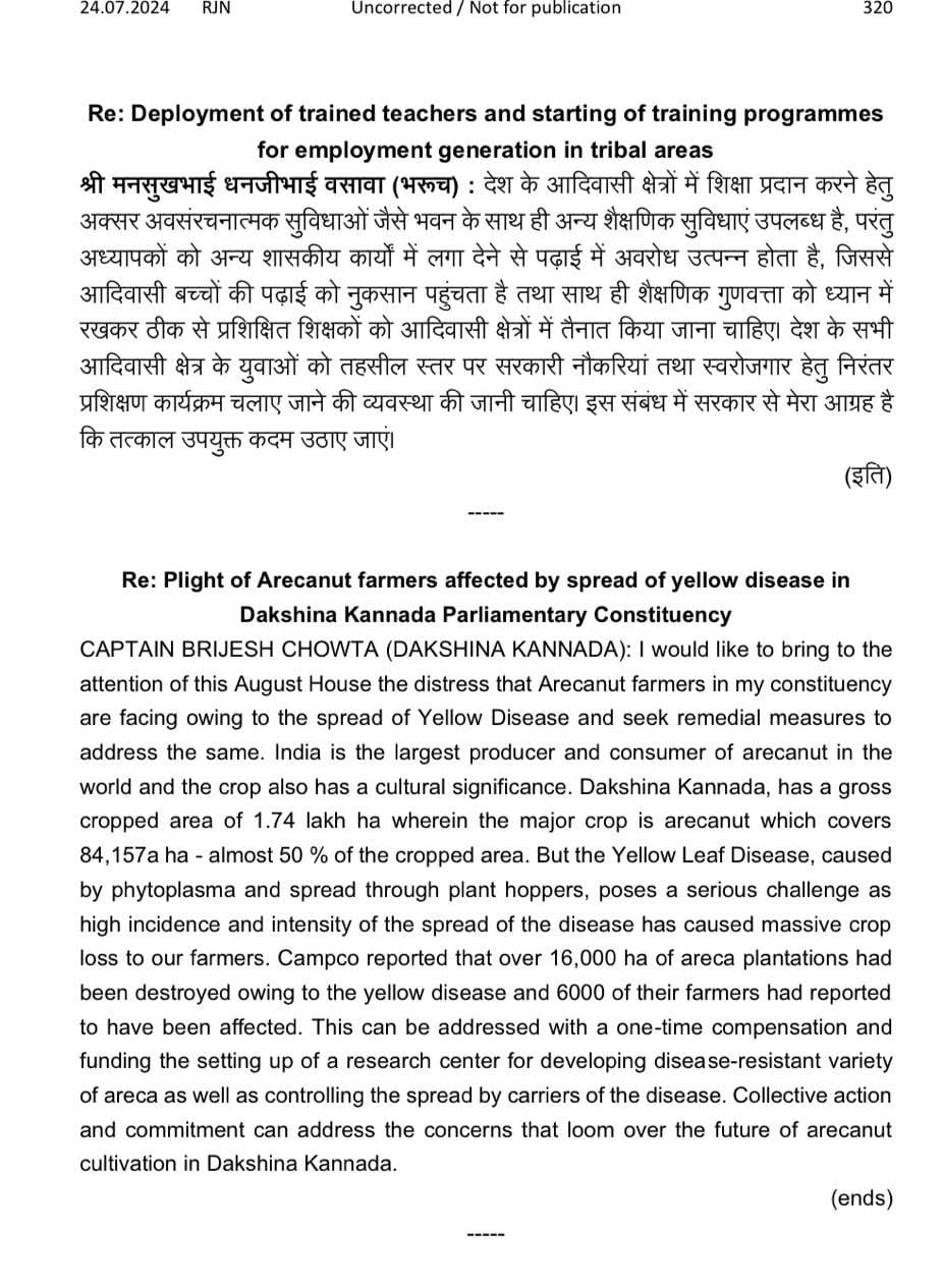 ನಿಯಮ 377 ರ ಅಡಿಯಲ್ಲಿ ಹಳದಿ ರೋಗದ ಹರಡುವಿಕೆಯಿಂದ ದಕ್ಷಿಣ ಕನ್ನಡ ಜಿಲ್ಲೆಯ ಅಡಿಕೆ ಬೆಳೆಗಾರರು ಅನುಭವಿಸುತ್ತಿರುವ ನಷ್ಟದ ಕುರಿತು ಲೋಕಸಭೆಯಲ್ಲಿ ಗಮನಸೆಳೆದ ಕ್ಯಾಪ್ಟನ್ ಬ್ರಿಜೇಶ್ ಚೌಟ- ಕಹಳೆ ನ್ಯೂಸ್