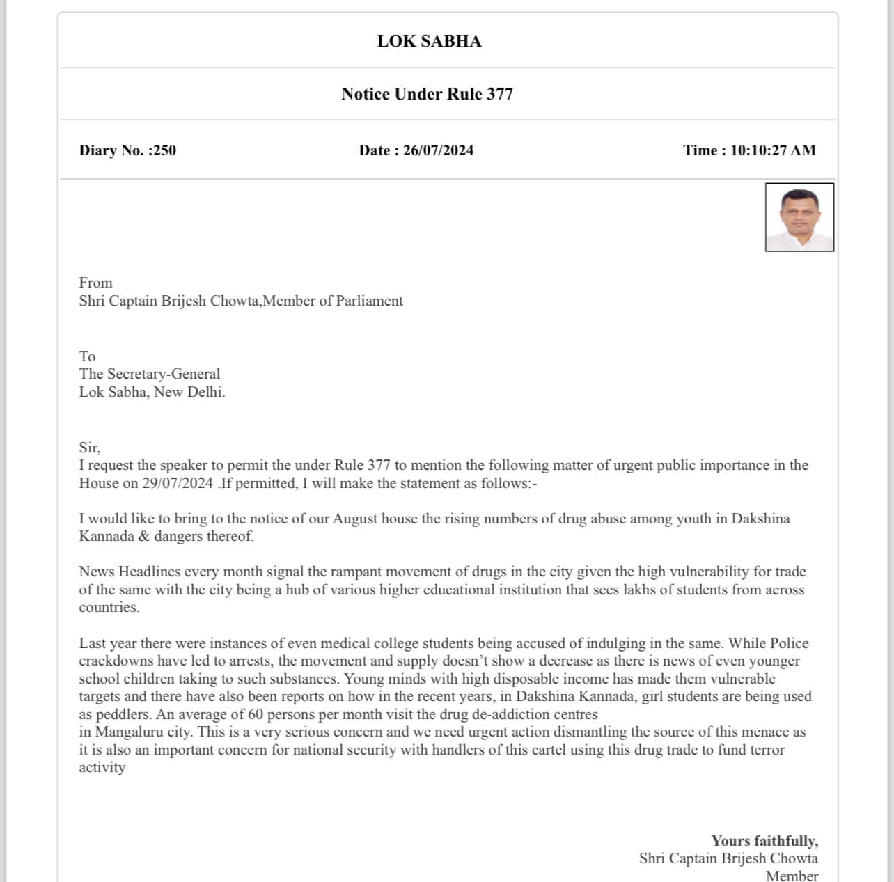 ನಿಯಮ 377ರ ಪ್ರಕಾರ ಲೋಕಸಭೆಯ ಅಧಿವೇಶನದ ಸಂದರ್ಭದಲ್ಲಿ ಸಂಸದರಿಗೆ ತಮ್ಮ ವಿಷಯಗಳನ್ನು ಸದನದ ಮುಂದಿಡುವ ಅವಕಾಶವಿದ್ದು ದಕ್ಷಿಣ ಕನ್ನಡ ಲೋಕಸಭಾ ಕ್ಷೇತ್ರದ ಸಂಸದರಾದ ಕ್ಯಾಪ್ಟನ್ ಬ್ರಿಜೇಶ್ ಚೌಟ ಅವರು ‘ದಕ್ಷಿಣ ಕನ್ನಡ ಜಿಲ್ಲೆಯಲ್ಲಿ ಮೇರೆ ಮೀರಿರುವ ಮಾದಕದ್ರವ್ಯ ವ್ಯಸನೆ ಮತ್ತು ಮಾರಾಟದ ಚಟುವಟಿಗೆಗಳ’ ಕುರಿತು ಸದನದ ಗಮನವನ್ನು ಸೆಳೆಯುವಲ್ಲಿ ಯಶಸ್ವಿಯಾಗಿದ್ದಾರೆ.