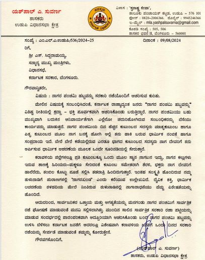 ಮುಂದಿನ ವರ್ಷದಿಂದ ನಾಗರ ಪಂಚಮಿಗೆ ಸರಕಾರಿ ರಜೆ ನೀಡಿ : ಮುಖ್ಯಮಂತ್ರಿಗಳಿಗೆ ಶಾಸಕ ಯಶ್ ಪಾಲ್ ಸುವರ್ಣ ಮನವಿ – ಕಹಳೆ ನ್ಯೂಸ್