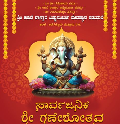 ಪುತ್ತೂರು : ಶ್ರೀ ಕೂವೆ ಶಾಸ್ತಾರ ವಿಷ್ಣುಮೂರ್ತಿ ದೇವಸ್ಥಾನ ಪಡುಮಲೆಯಲ್ಲಿ ಸೆ. 07ರಂದು ಸಾರ್ವಜನಿಕ ಶ್ರೀ ಗಣೇಶೋತ್ಸವ ನಡೆಯಲಿದೆ.