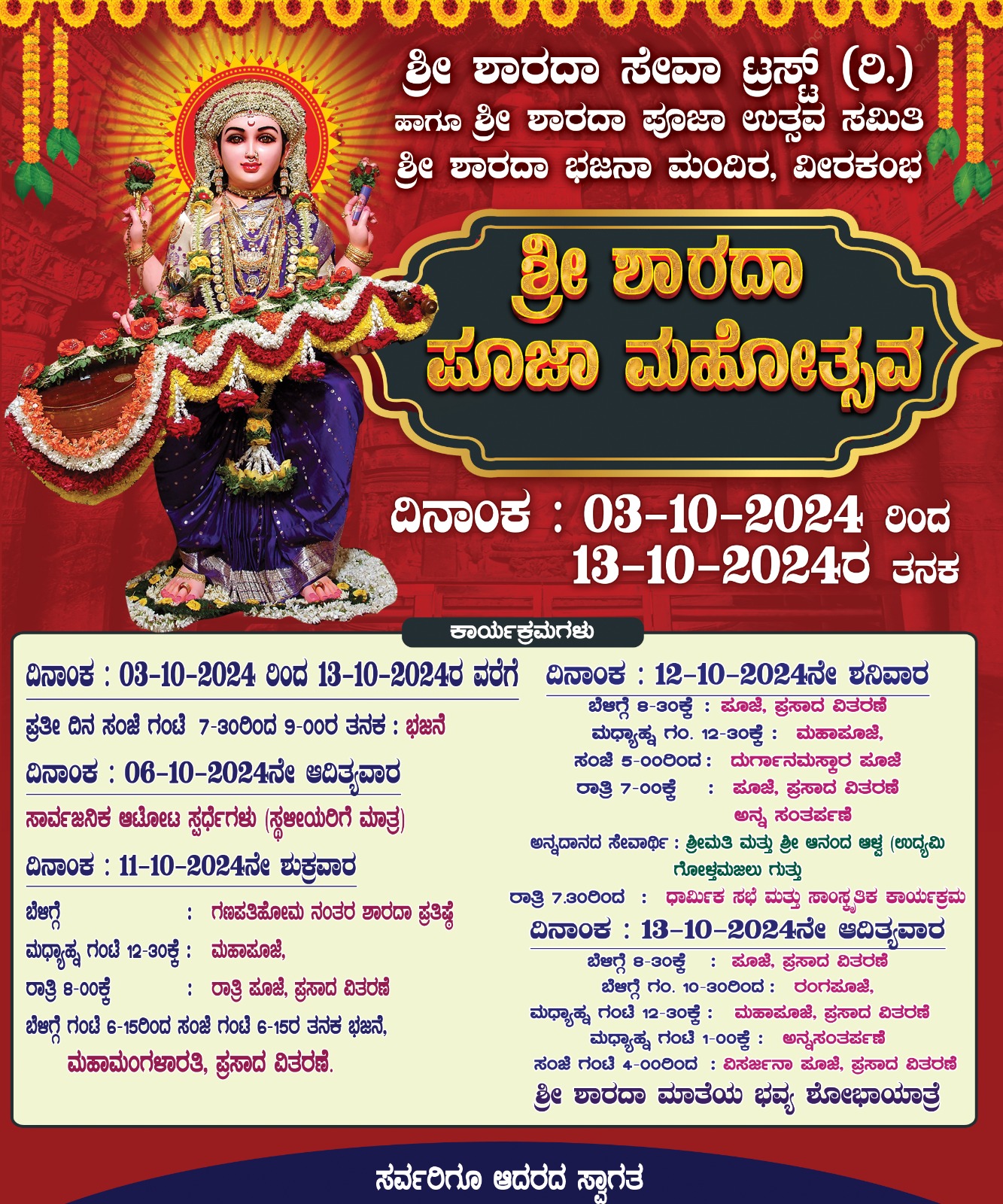 ಅ.13-ರ ಮಧ್ಯಾಹ್ನ ರಂಗಪೂಜೆ, ಮಹಾಪೂಜೆ ನಂತರ ಸಾರ್ವಜನಿಕ ಅನ್ನ ಸಂತರ್ಪಣೆ ನಡೆದು ಸಂಜೆ ಗಂಟೆ 4ಕ್ಕೆ ಸರಿಯಾಗಿ ವಿಸರ್ಜನಾ ಪೂಜೆ ನಡೆದು ನಂತರ ಶ್ರೀ ಶಾರದಾ ಮಾತೆಯ ಭವ್ಯ ಶೋಭಯಾತ್ರೆ ನೆರವೇರಲಿದೆ.