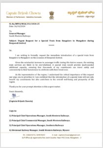 ದೀಪಾವಳಿ ಹಬ್ಬದ ಹಿನ್ನಲೆಯಲ್ಲಿ ದಕ್ಷಿಣ ಕನ್ನಡ ಹಾಗೂ ಉಡುಪಿ ಭಾಗದ ಜನರು ಹೆಚ್ಚಿನ ಸಂಖ್ಯೆಯಲ್ಲಿ ಬೆಂಗಳೂರು-ಮಂಗಳೂರು ನಡುವೆ ಸಂಚರಿಸುತ್ತಾರೆ. ಆದರೆ, ಹಬ್ಬದ ಸೀಸನ್ನಲ್ಲಿ ಈಗಾಗಲೇ ಪ್ರಯಾಣಿಕರ ದಟ್ಟನೆ ಜಾಸ್ತಿಯಾಗಿ ಬಸ್ಗಳಲ್ಲಿ ಟಿಕೆಟ್ ಲಭ್ಯವಾಗದ ಹಲವರು ಊರಿಗೆ ಬರುವುದಕ್ಕೆ ಸಾಧ್ಯವಾಗದೆ ತೊಂದರೆಗೆ ಸಿಲುಕುತ್ತಾರೆ. ಹೀಗಾಗಿ, ದೀಪಾವಳಿ ಹಬ್ಬಕ್ಕೆ ಕರಾವಳಿ ಭಾಗದ ಜನರಿಗೆ ಅನುಕೂಲವಾಗುವಂತೆ ವಿಶೇಷ ರೈಲು ಸಂಚಾರದ ವ್ಯವಸ್ಥೆ ಮಾಡುವಂತೆ ಸಂಸದ ಕ್ಯಾ. ಚೌಟ ಅವರು ನೈರುತ್ಯ ರೈಲ್ವೆ ವಲಯಕ್ಕೆ ಹಾಗೂ ರೈಲ್ವೆ ಇಲಾಖೆಯ ಸಂಬಂಧಪಟ್ಟ ಅಧಿಕಾರಿಗಳಿಗೆ ಮನವಿ ಮಾಡಿದ್ದರು. ಇದೀಗ ಮನವಿಗೆ ಶೀಘ್ರ ಸ್ಪಂದಿಸಿ ವಿಶೇಷ ರೈಲು ಸೇವೆ ಮಂಜೂರು ಮಾಡಿರುವುದಕ್ಕೆ ಕ್ಯಾ. ಚೌಟ ಅವರು ರೈಲ್ವೆ ಸಚಿವರಾದ ಅಶ್ವಿನ್ ವೈಷ್ಣವ್, ರೈಲ್ವೆ ಖಾತೆ ರಾಜ್ಯ ಸಚಿವರಾದ ವಿ. ಸೋಮಣ್ಣ ಹಾಗೂ ರೈಲ್ವೆ ಇಲಾಖೆ ಅಧಿಕಾರಿಗಳಿಗೆ ಕೃತಜ್ಞತೆ ಸಲ್ಲಿಸಿದ್ದಾರೆ.