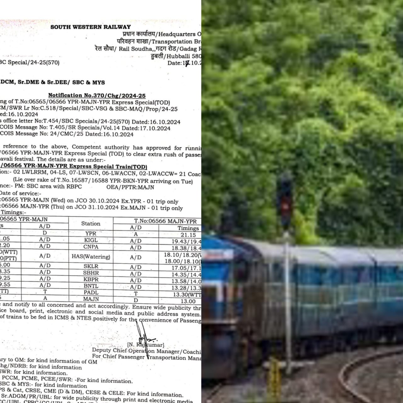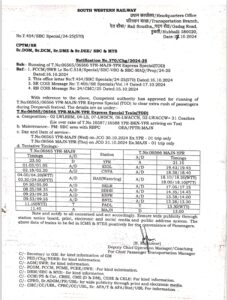 ಅದರಂತೆ ಯಶವಂತಪುರ-ಮಂಗಳೂರು(06565) ವಿಶೇಷ ರೈಲು ಅ.30ರಂದು ರಾತ್ರಿ 11.50ಕ್ಕೆ ಯಶವಂತಪುರದಿಂದ ಹೊರಟು ಮರುದಿನ ಬೆಳಗ್ಗೆ 11.45ಕ್ಕೆ ಮಂಗಳೂರು ತಲುಪಲಿದೆ. ಹಾಗೆಯೇ ಮಂಗಳೂರು-ಯಶವಂತಪುರ(ನಂ. 06566) ವಿಶೇಷ ರೈಲು ಮಂಗಳೂರಿನಿಂದ ಅ.31ರಂದು ಮಧ್ಯಾಹ್ನ 1 ಗಂಟೆಗೆ ಹೊರಟು ಅದೇ ದಿನ ರಾತ್ರಿ 9.15ಕ್ಕೆ ಯಶವಂತಪುರ ತಲುಪಲಿದೆ.