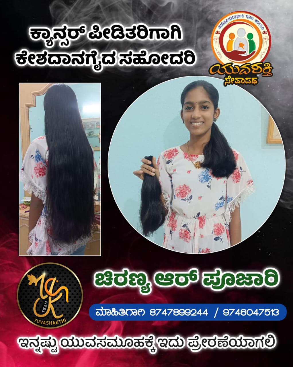 ಚಿರಣ್ಯ ಖ ಪೂಜಾರಿ ವೀರಕಂಭ ಗ್ರಾಮದ ಗಣೇಶಕೋಡಿಯ ರಾಮಚಂದ್ರ ರೇಖಾ ದಂಪತಿಗಳ ಪುತ್ರಿಯಾಗಿದ್ದು, ತನ್ನ ಮಗಳನ್ನು ಕೇಶದಾನಗೈಯಲು ಪ್ರೇರಣೆ ನೀಡಿದ ರಾಮಚಂದ್ರರವರು ಆತ್ಮೀಯ ಮಿತ್ರರೆಲ್ಲರ ಸಹಕಾರದೊಂದಿಗೆ ಓಂ ಶ್ರೀ ಸಾಯಿಗಣೇಶ ಸೇವಾ ಸಂಘದ ಸಾರಥಿಯಾಗಿ ಅಶಕ್ತರಿಗೆ ನೆರವು ನೀಡುತ್ತಾ ಯುವಶಕ್ತಿ ಸೇವಾಪಥ, ಯುವಶಕ್ತಿ ರಕ್ತನಿಧಿಯ ಮೂಲಕ ಸಮಾಜ ಸೇವೆಗೆ ಸದಾ ಕೈ ಜೋಡಿಸುವ ಓರ್ವ ನಿಷ್ಠಾವಂತ ಕಾರ್ಯಕರ್ತರಾಗಿರುತ್ತಾರೆ. ಇವರ ಈ ಸೇವಾಕಾರ್ಯ ಎಲ್ಲರಿಗೂ ಪ್ರೇರಣೆಯಾಗಲಿ.