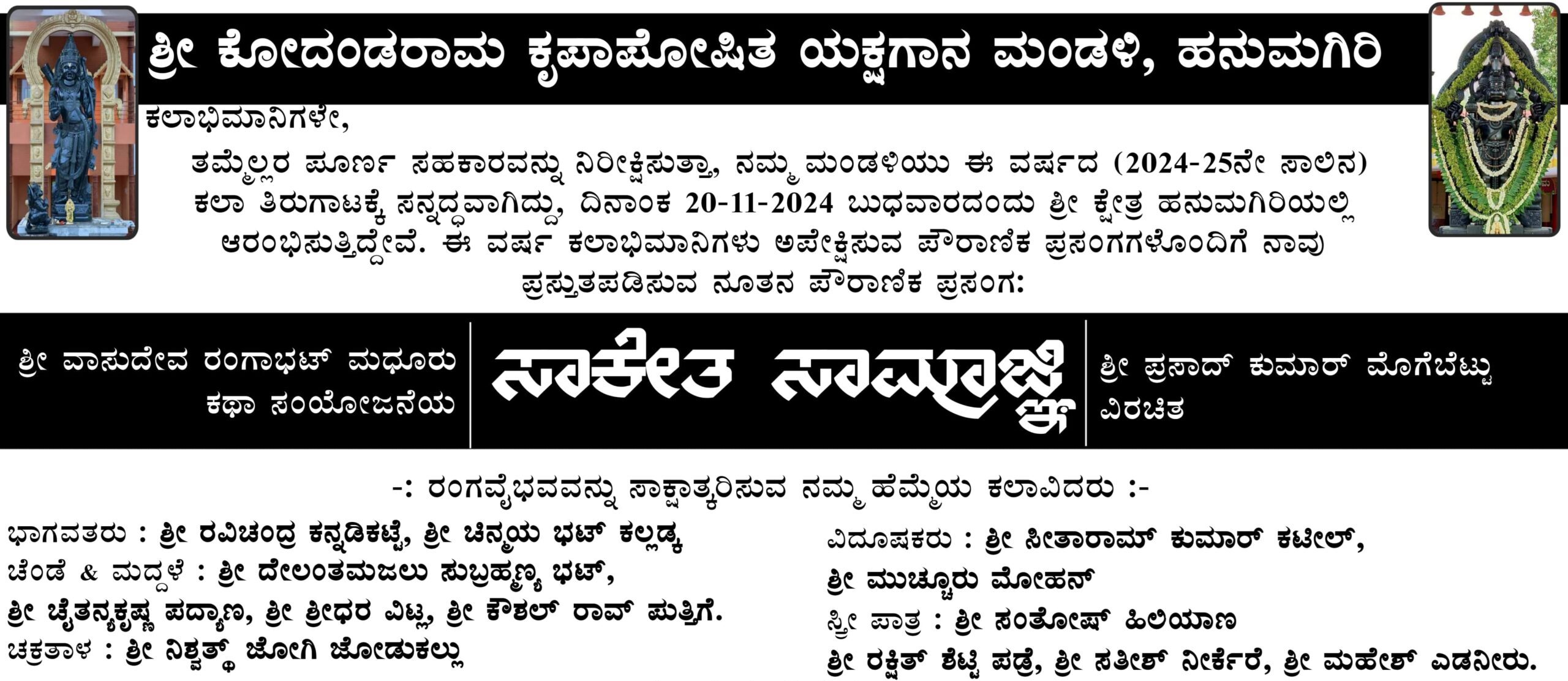 ಶ್ರೀ ವಾಸುದೇವ ರಂಗಾಭಟ್ ಮಧೂರು ಕಥಾ ಸಂಯೋಜನೆಯ ಶ್ರೀ ಪ್ರಸಾದ್ ಕುಮಾರ್ ಮೊಗೆಬೆಟ್ಟು ವಿರಚಿತ ಈ ವರ್ಷದ ನೂತನ “ಸಾಕೇತ ಸಾಮ್ರಾಜ್ಞೆ” ಪೌರಾಣಿಕ ಪ್ರಸಂಗದ ಹಿಮ್ಮೇಳದಲ್ಲಿ ಭಾಗವತರಾಗಿ ಶ್ರೀ ರವಿಚಂದ್ರ ಕನ್ನಡಿಕಟ್ಟೆ, ಶ್ರೀ ಚಿನ್ಮಯ ಭಟ್ ಕಲ್ಲಡ್ಕ, ವಿದೂಷಕರಾಗಿ ಶ್ರೀ ಸೀತಾರಾಮ್ ಕುಮಾರ್ ಕಟೀಲ್,ಶ್ರೀ ಮುಚೂರು ಮೋಹನ್ . ಚೆಂಡೆ & ಮದ್ದಳೆಯಲ್ಲಿ ಶ್ರೀ ದೇಲಂತಮಜಲು ಸುಬ್ರಹ್ಮಣ್ಯ ಭಟ್, , ಶ್ರೀ ಚೈತನ್ಯಕೃಷ್ಣ ಪದ್ಯಾಣ, ಶ್ರೀ ಶ್ರೀಧರ ವಿಟ್ಲ, ಹಾಗೂ ಶ್ರೀ ಕೌಶಲ್ ರಾವ್ ಪುತ್ತಿಗೆ, ಚಕ್ರತಾಳದಲ್ಲಿ ಶ್ರೀ ನಿಶ್ವತ್ ಜೋಗಿ ಜೋಡುಕಲ್ಲು ಭಾಗವಹಿಸಲಿದ್ದಾರೆ.