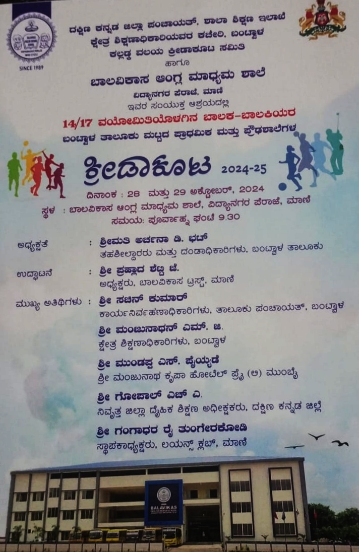 ಅ. 28 ಮತ್ತು 29ರಂದು ಬಾಲವಿಕಾಸ ಆಂಗ್ಲ ಮಾಧ್ಯಮ ಶಾಲೆ, ಮಾಣಿಯಲ್ಲಿ 2024-25 ಸಾಲಿನ ಪ್ರಾಥಮಿಕ ಹಾಗೂ ಪ್ರೌಢ ಶಾಲೆಗಳ ಬಾಲಕ – ಬಾಲಕಿಯರ ಬಂಟ್ವಾಳ ತಾಲೂಕು ಮಟ್ಟದ ಕ್ರೀಡಾಕೂಟ – ಕಹಳೆ ನ್ಯೂಸ್