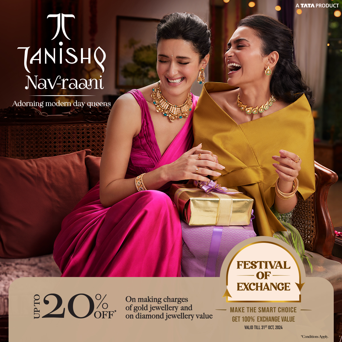 ವಿನಿಮಯದ ಹಬ್ಬ: ನಿಮ್ಮ ಹಳೆಯ ಚಿನ್ನವನ್ನು ಶೇಕಡ 100 ರಷ್ಟು ಮೌಲ್ಯದಲ್ಲಿ ವಿನಿಮಯ ಮಾಡಿಕೊಳ್ಳುವ ಮೂಲಕ ಹೆಚ್ಚುವರಿಯಾಗಿ ಏನನ್ನೂ ಪಾವತಿಸದೆ ನವ-ರಾಣಿ ಆಭರಣವನ್ನು ಮನೆಗೆ ತನ್ನಿ ಅಕ್ಟೋಬರ್ 2024: ಟಾಟಾ ಸಮೂಹಕ್ಕೆ ಸೇರಿದ ಭಾರತದ ಅತಿದೊಡ್ಡ ಆಭರಣ ರಿಟೇಲ್ ಆಭರಣ ಬ್ರ್ಯಾಂಡ್ ತನಿಷ್ಕ್ ಹಬ್ಬದ ಋತುವನ್ನು ಸಂತೋಷ ಮತ್ತು ಉಲ್ಲಾಸದಿಂದ ಆಚರಿಸಲು ಅತ್ಯಾಕರ್ಷಕ ಕೊಡುಗೆಗಳನ್ನು ಪ್ರಕಟಿಸಿದೆ.