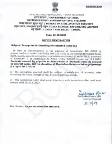 ಪ್ರಸ್ತುತ ಅಯ್ಯಪ್ಪನ ಇರುಮುಡಿ ವಿಮಾನದಲ್ಲಿ ಪ್ರಯಾಣಿಸುವಾಗ ತಮ್ಮೊಂದಿಗೆ ಕೊಂಡೊಯ್ಯಲು ಅನುಮತಿ ನೀಡಲಾಗಿದೆ. ಈ ಹಿಂದೆ ಕೆಲವು ಭದ್ರತಾ ಕಾರಣಗಳಿಂದಾಗಿ, ಇರುಮುಡಿಯನ್ನು ವಿಮಾನಗಳಲ್ಲಿ ಅನುಮತಿ ನೀಡುತ್ತಿರಲಿಲ್ಲ. ಆದರೆ ಕೇಂದ್ರ ನಾಗರಿಕ ವಿಮಾನಯಾನ ಸಚಿವ ಕಿಂಜರಾಪು ರಾಮಮೋಹನ್ ನಾಯ್ಡು ಮಹತ್ವದ ನಿರ್ಧಾರ ಕೈಗೊಂಡಿದ್ದಾರೆ. ಅಯ್ಯಪ್ಪ ಸ್ವಾಮಿ ವಿಮಾನಗಳಲ್ಲಿ ಪ್ರಯಾಣಿಸುವಾಗ ಚೆಕ್-ಇನ್ ಬ್ಯಾಗೇಜ್ ಬದಲಿಗೆ ಇರುಮುಡಿ ತೆಗೆದುಕೊಂಡು ಹೋಗಬಹುದು ಎಂದು ಹೇಳಿದರು.