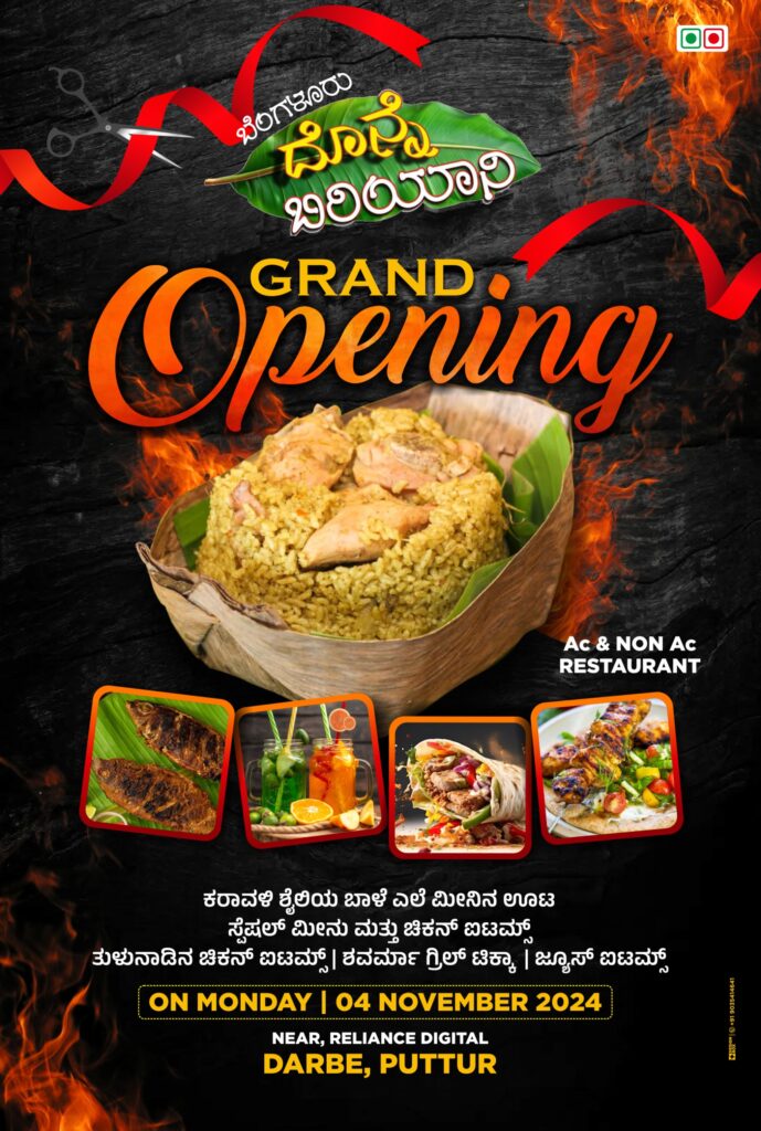 ಪುತ್ತೂರು-ದರ್ಬೆ ರಸ್ತೆಯ ರಿಲಯನ್ಸ್ ಡಿಜಿಟಲ್ ಸಮೀಪ ನ.4 ರಂದು ‘ಬೆಂಗಳೂರು ದೊನ್ನೆ ಬಿರಿಯಾನಿ’ ರೆಸ್ಟೋರೆಂಟ್ ಅದ್ದೂರಿಯಾಗಿ ಶುಭಾರಂಭಗೊಳ್ಳಲಿದೆ.