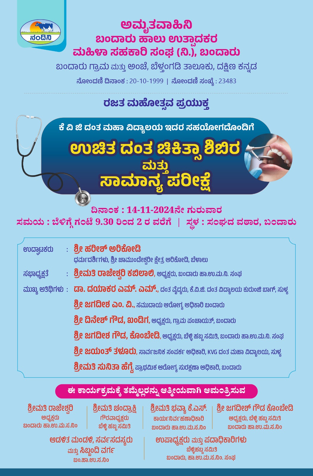 ಬಂದಾರು ಹಾಲು ಉತ್ಪಾದಕರ ಮಹಿಳಾ ಸಹಕಾರಿ ಸಂಘ (ನಿ.) ಇದರ ರಜತ ಮಹೋತ್ಸವ ಪ್ರಯುಕ್ತ ನ.14ರಂದು ಬಂದಾರಿನಲ್ಲಿ ಉಚಿತ ದಂತ ಚಿಕಿತ್ಸಾ ಶಿಬಿರ ಮತ್ತು ಸಾಮಾನ್ಯ ಪರೀಕ್ಷೆ – ಕಹಳೆ ನ್ಯೂಸ್