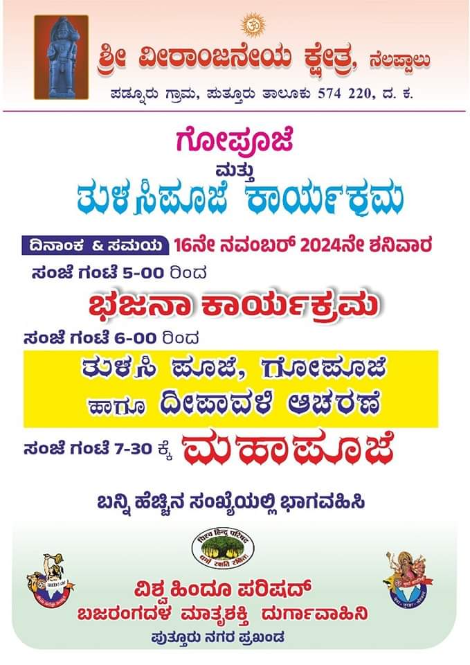 ನೆಲಪ್ಪಾಲು ಶ್ರೀ ವೀರಾಂಜನೇಯ ಕ್ಷೇತ್ರದಲ್ಲಿ ಗೋಪೂಜೆ ಮತ್ತು ತುಳಸಿಪೂಜಾ ಕರ್ಯಕ್ರಮ-ಕಹಳೆ ನ್ಯೂಸ್