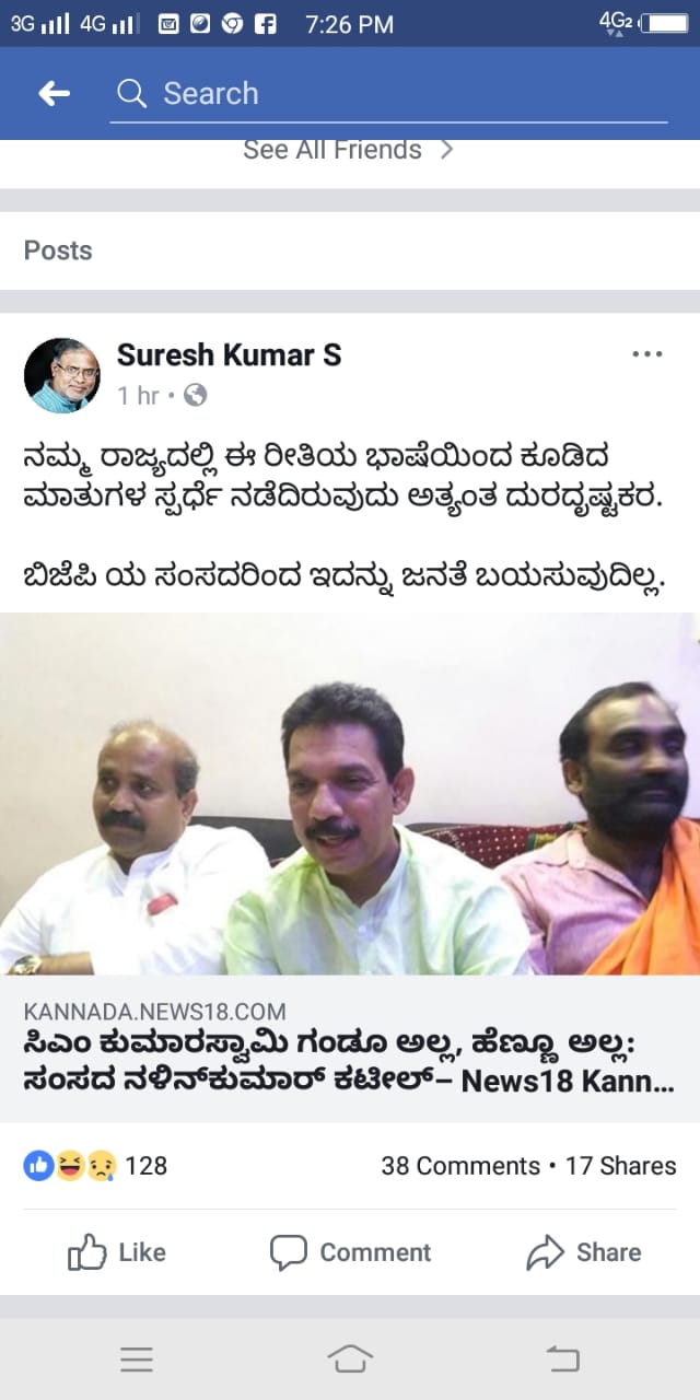 ತಮ್ಮ ಫೇಸ್ ಬುಕ್ ಕಾತೆಯಲ್ಲಿ ಸಂಸದ ನಳೀನ್ ಗೆ ಎಸ್ ಸುರೇಶ್ ಕುಮಾರ್ ಕ್ಲಾಸ್ ತೆಗೆದುಕೊಂಡಿದ್ದಾರೆ. ಏನ್ ಬರ್ದಿದ್ದಾರೆ ಗೊತ್ತಾ ?
